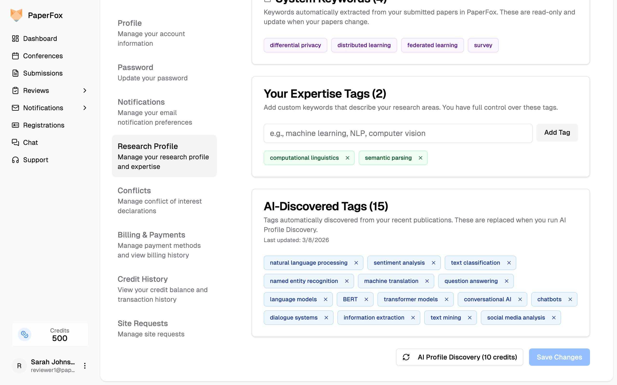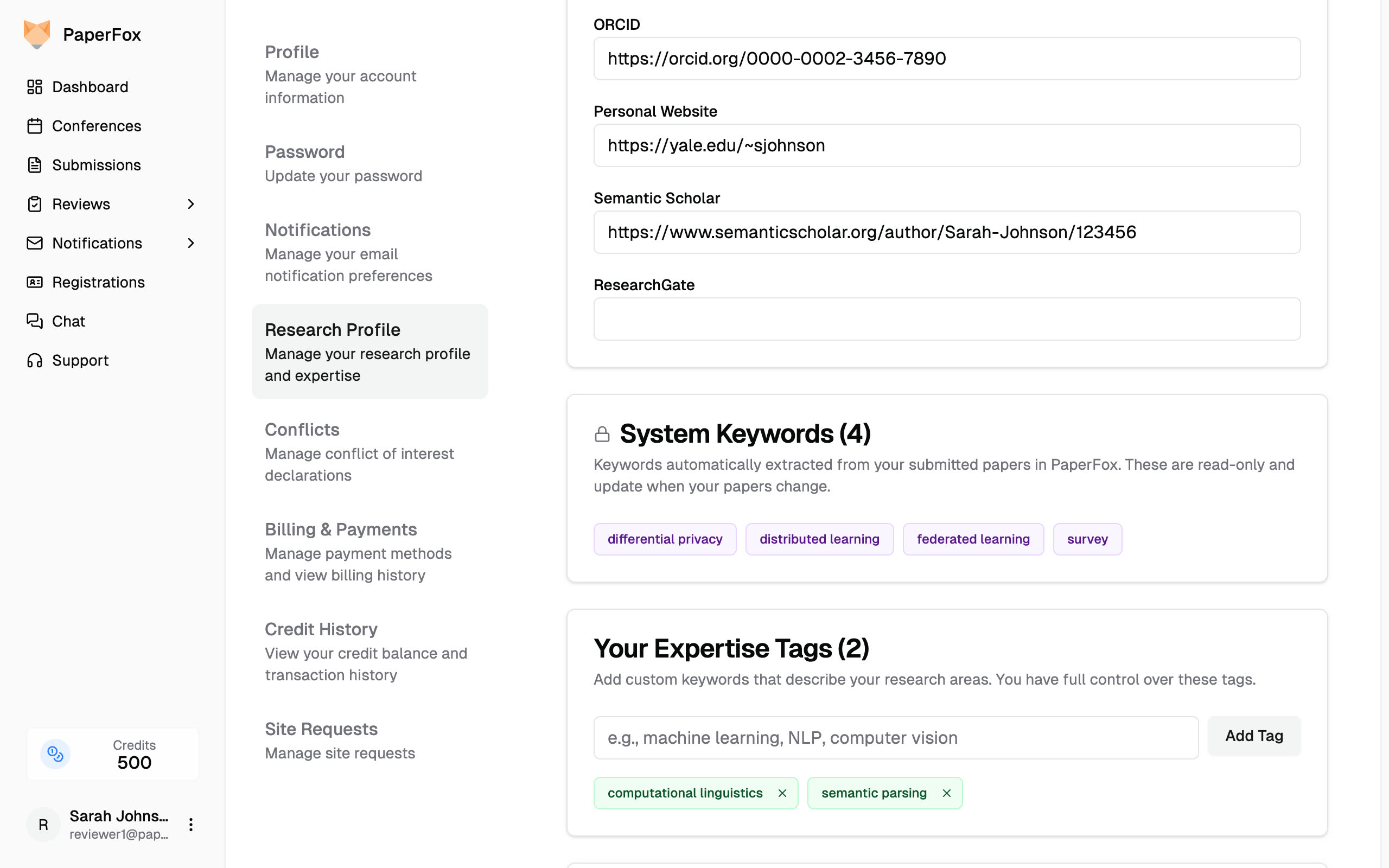 When a reviewer is invited to a conference, PaperFox runs a public AI web search based on their name, email, affiliation, and country to find their publications — Google Scholar, ORCID, Semantic Scholar, and academic websites. From their recent papers, it extracts expertise keywords and builds a research profile. No manual data entry required.