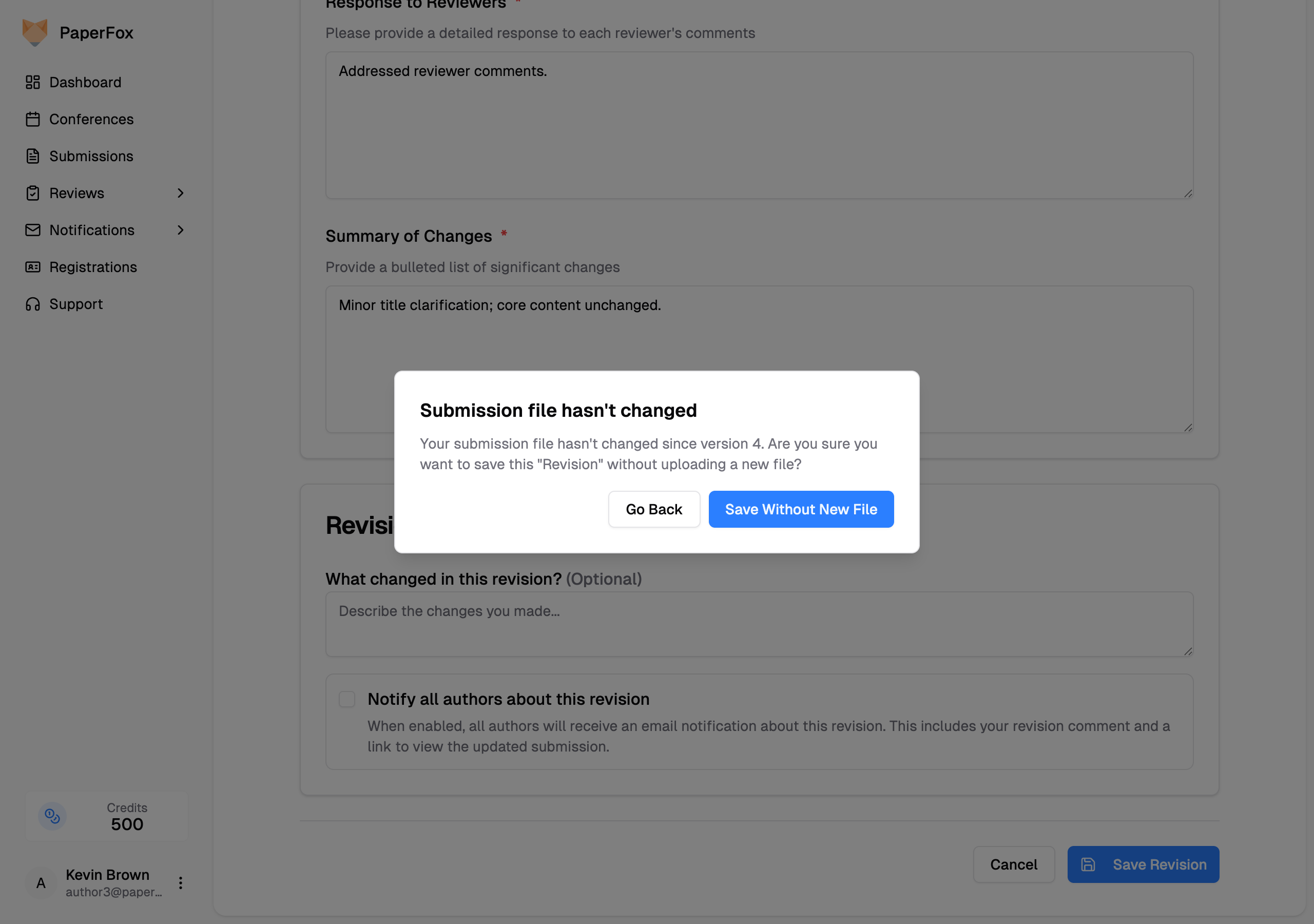 When you're revising a paper in a post-submission phase (for example, Camera Ready, Final Version, or whatever your chairs named it), PaperFox checks whether you actually uploaded a new file. If your submission file is still the same one from the previous version, you'll see a confirmation before the revision is saved.