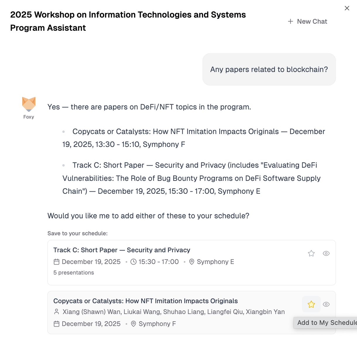 Attendees can add sessions or program items to their favorites directly through the chat interface: