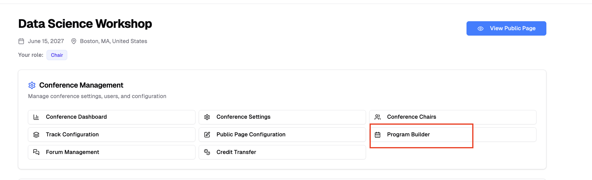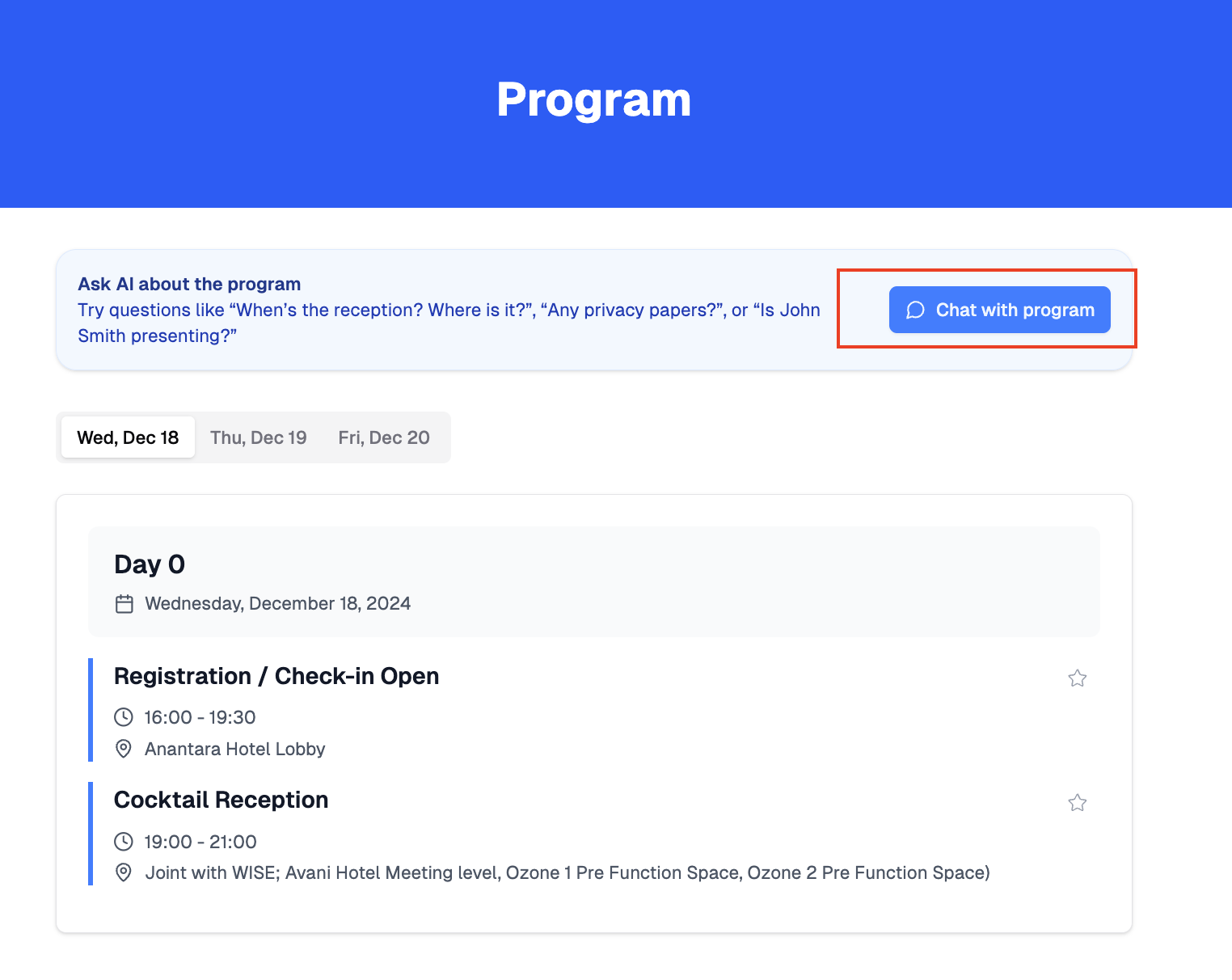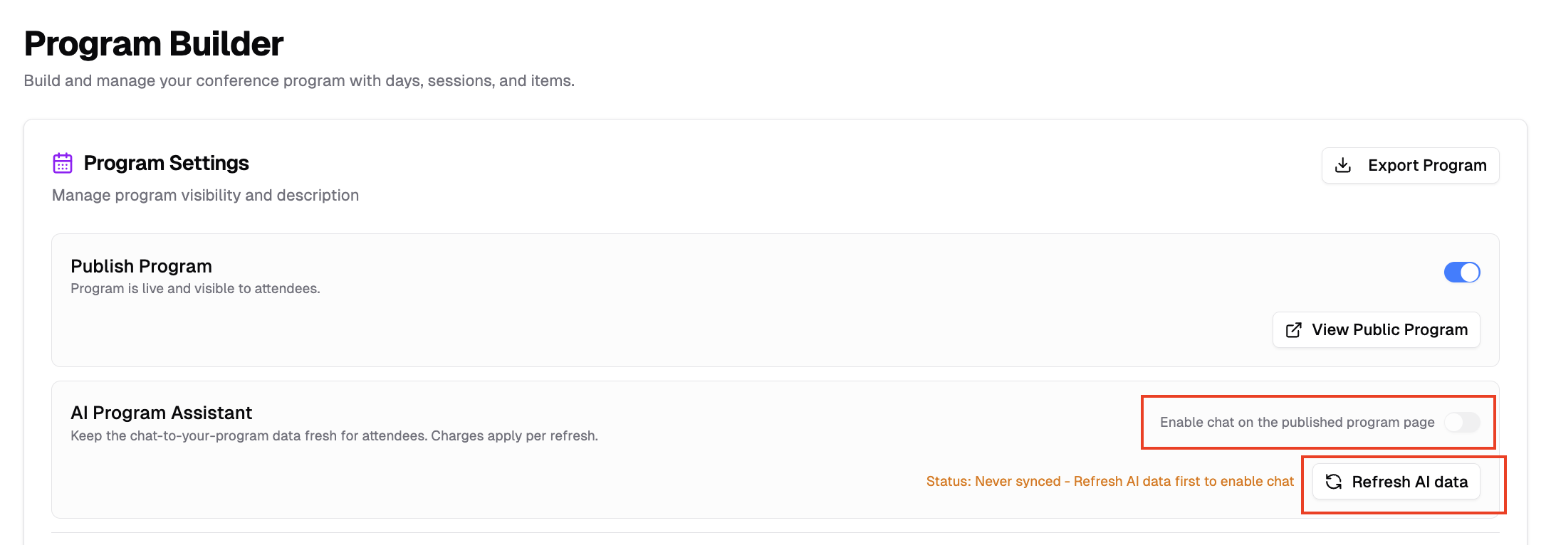 Enable AI-powered chat for your conference program to help attendees quickly find sessions, speakers, and schedule information.