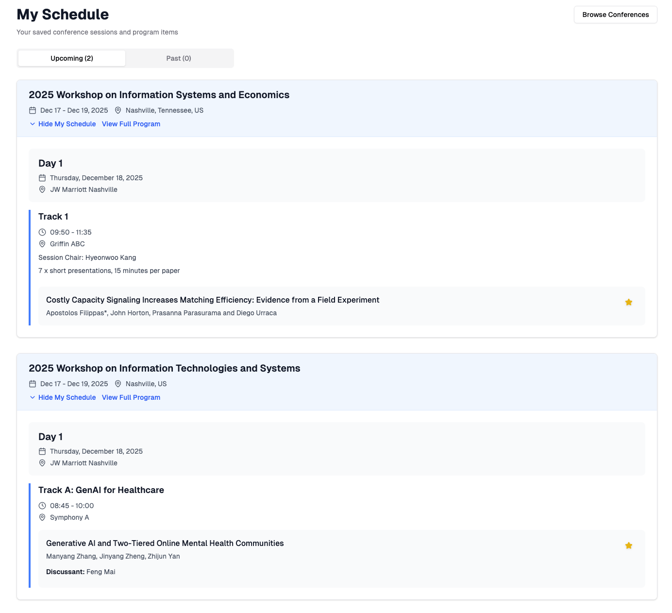 This feature helps attendees build their personalized conference schedule while exploring the program.