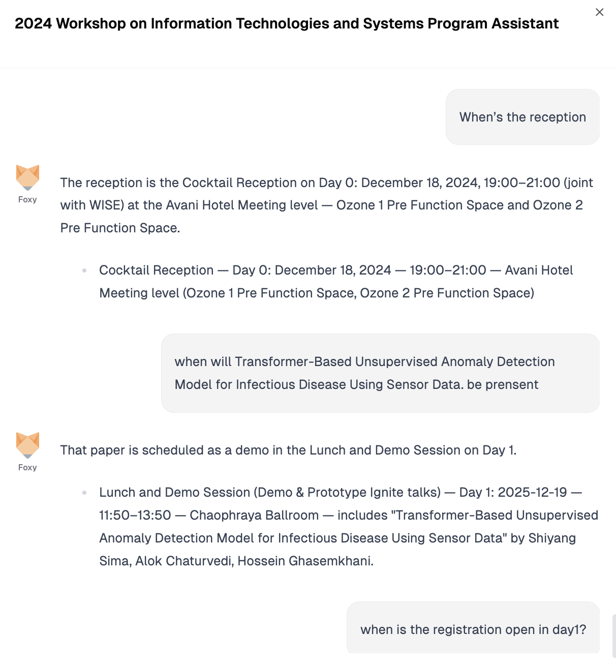 Attendees can ask the AI assistant about sessions, speakers, topics, schedule, and logistics.