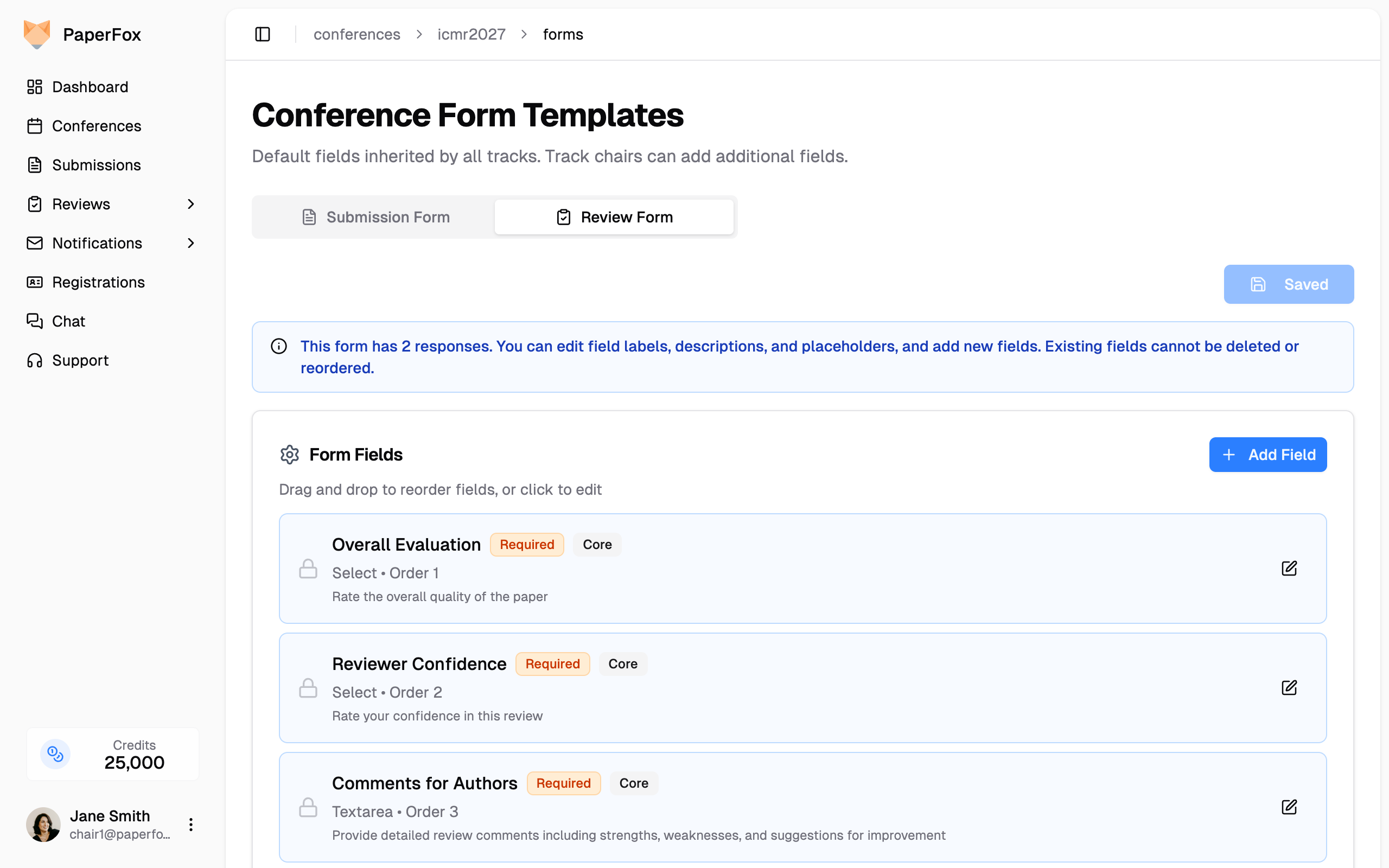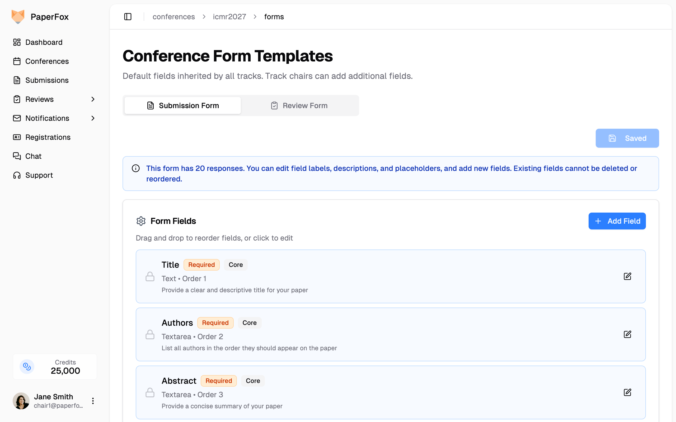 As a conference chair, you can configure default submission and review form templates at the conference level. These templates define the base fields that all tracks inherit automatically. Track chairs can then add additional fields to customize their track's forms.