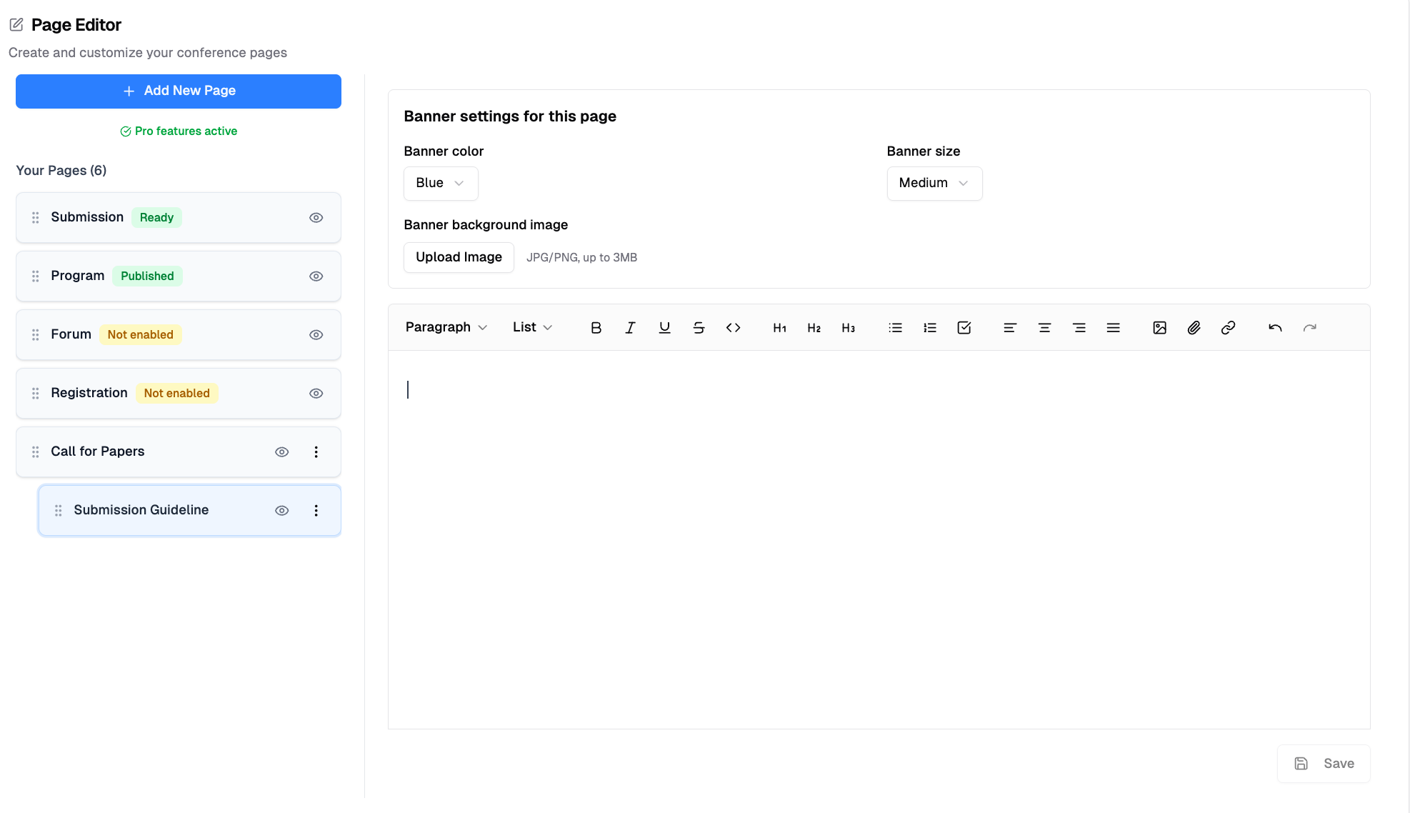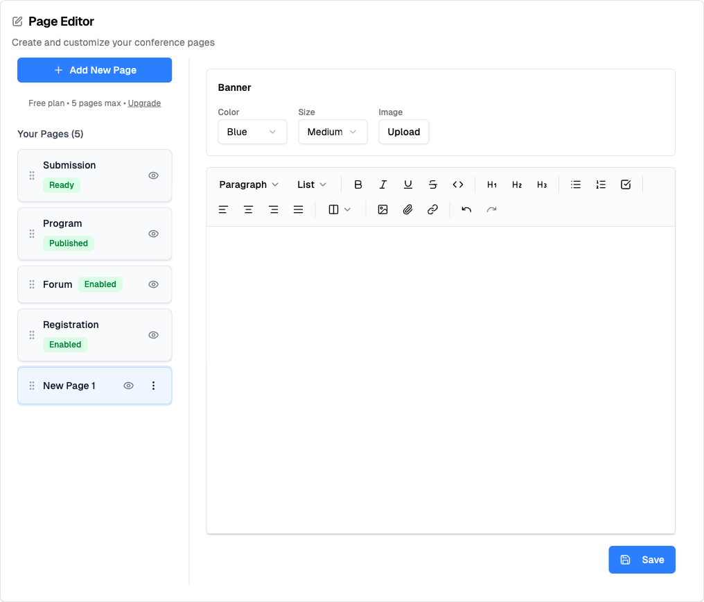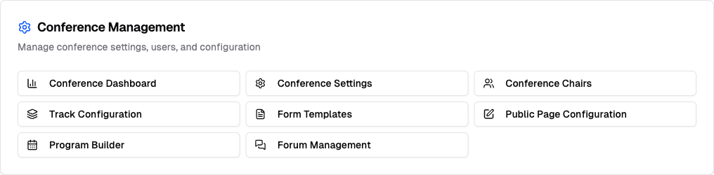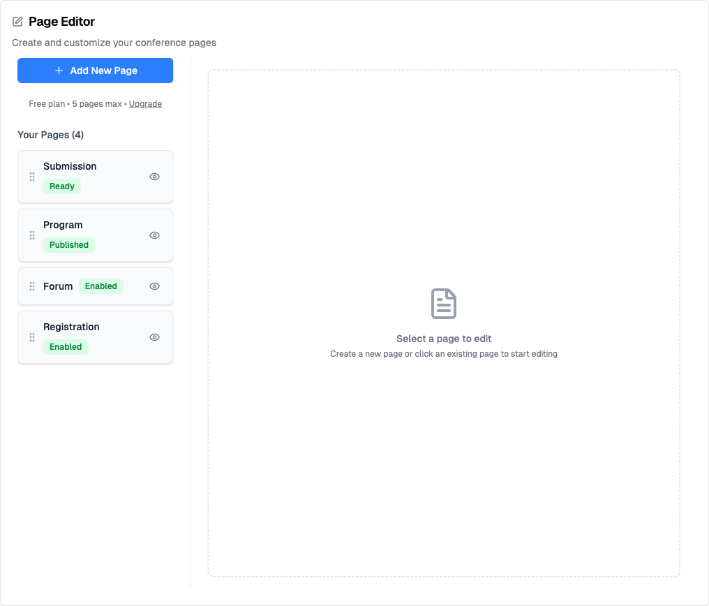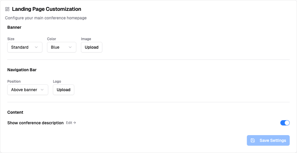 - Show conference description: Toggle whether to display your conference description on the landing page. Click "Edit →" to update the description in Conference Settings.