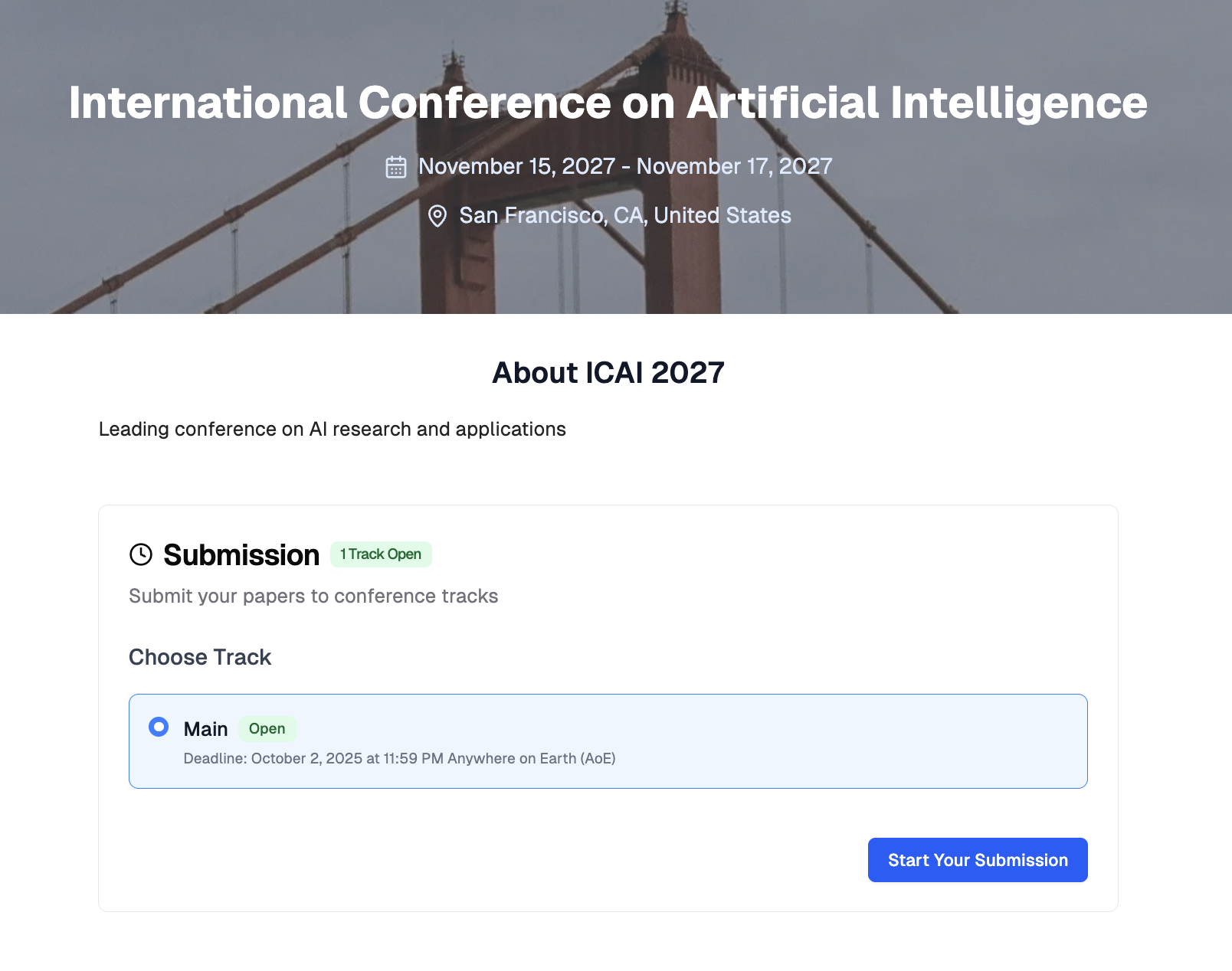 | Submission | Ready | Lists tracks with deadlines. Authors submit papers here. |