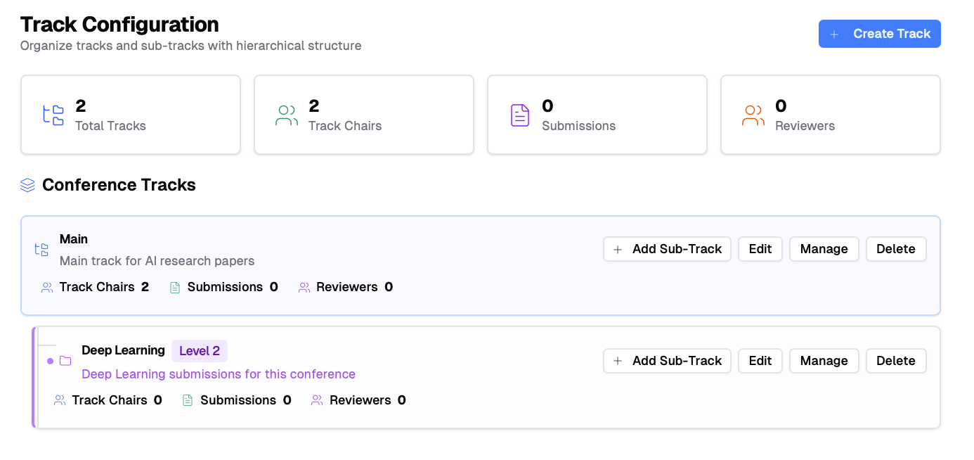 Sub-tracks allow you to organize your conference into specialized areas under a main track. For example, under a "Machine Learning" track, you can create sub-tracks for "Deep Learning" and "Computer Vision".