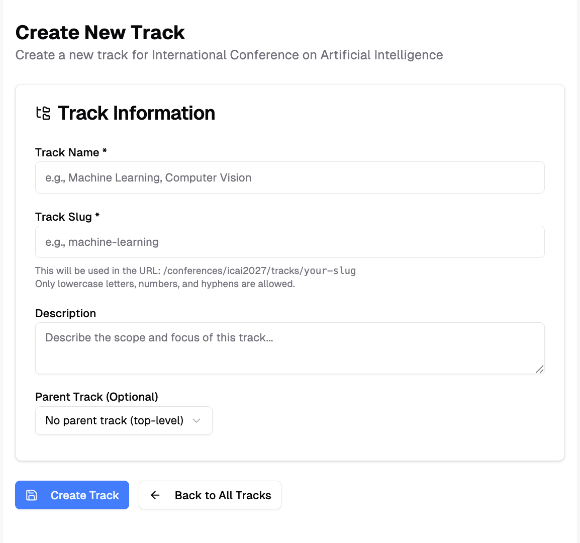 - Track Slug: URL-friendly identifier (e.g., "ai", "data-science")