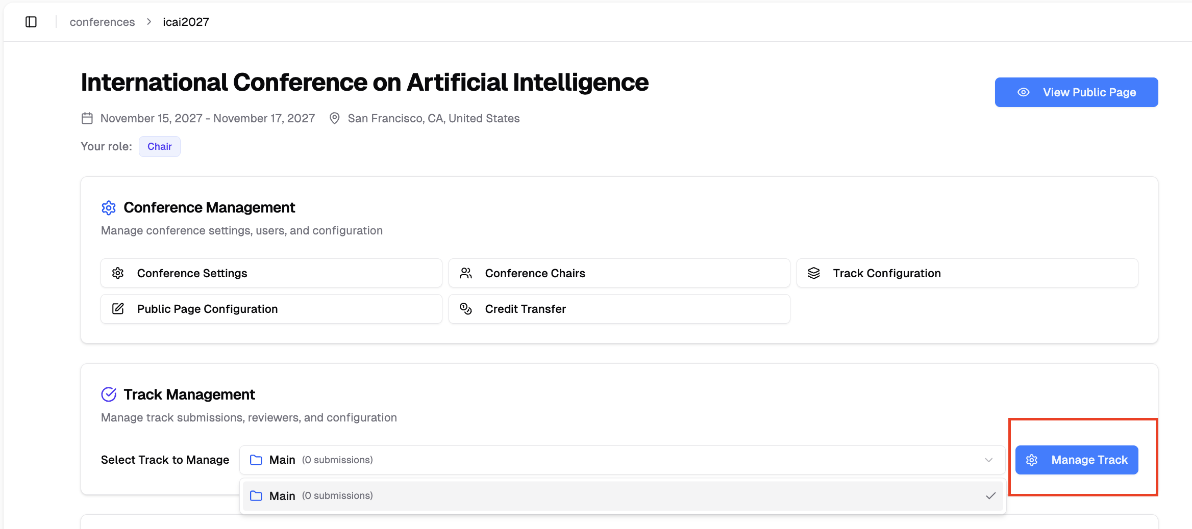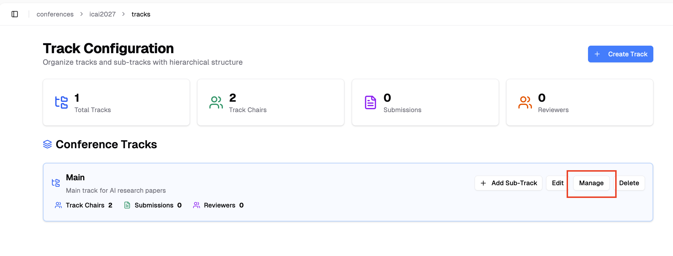 Congratulations! You have successfully created your conference tracks. Now you can invite track chairs to help manage each track.