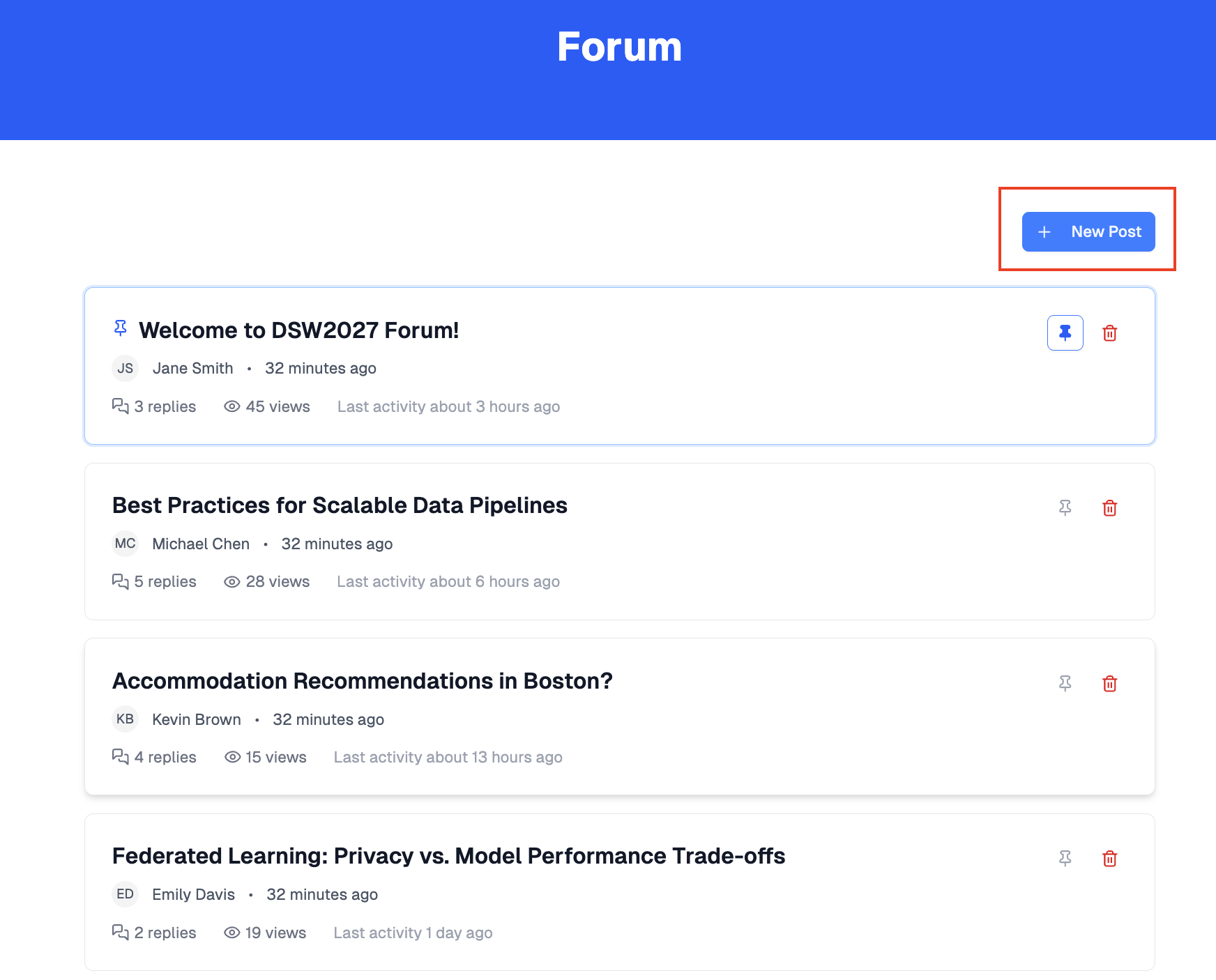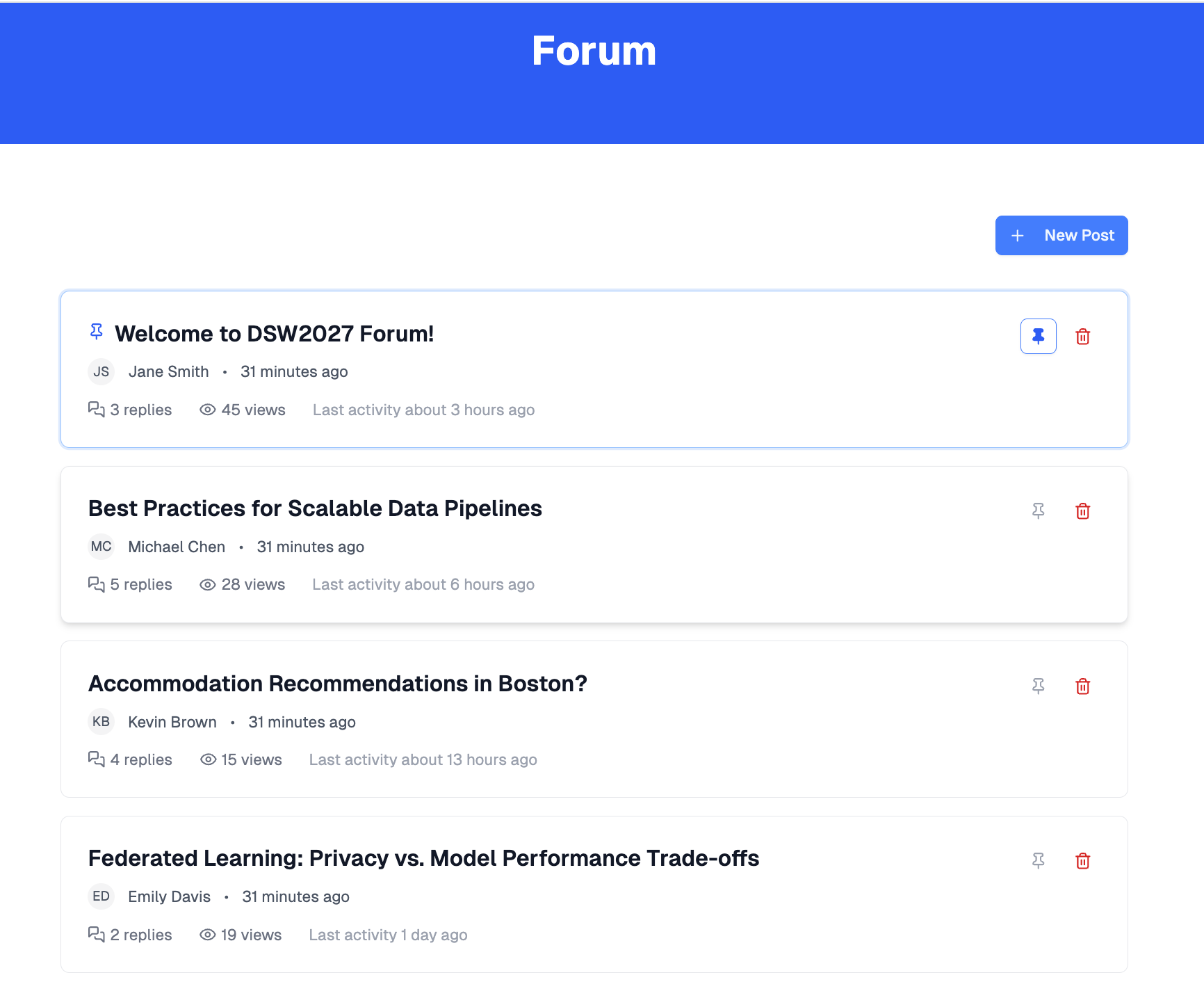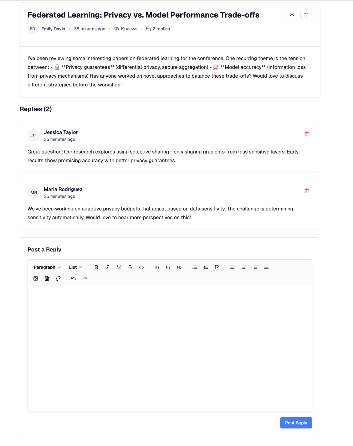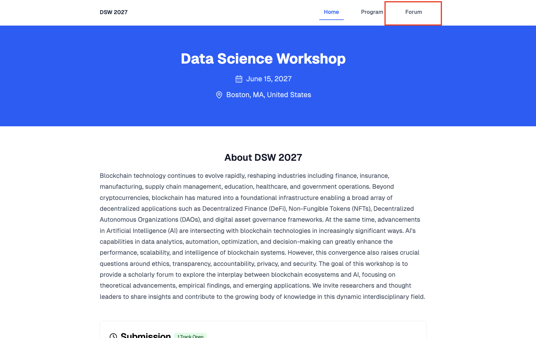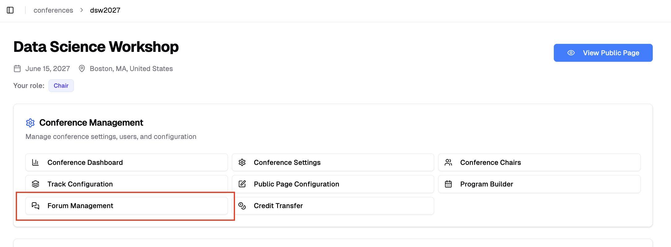 Conference forums provide a space for attendees to discuss topics, ask questions, and engage with the community. As a conference chair, you can enable forums and assign moderators to help manage discussions.