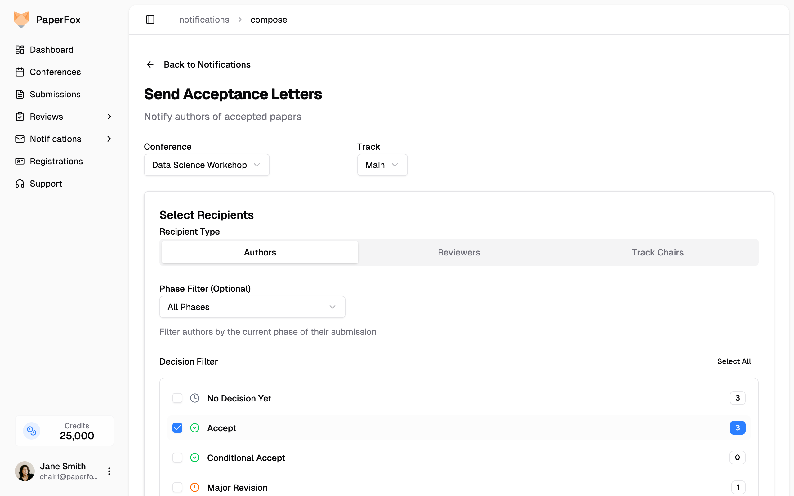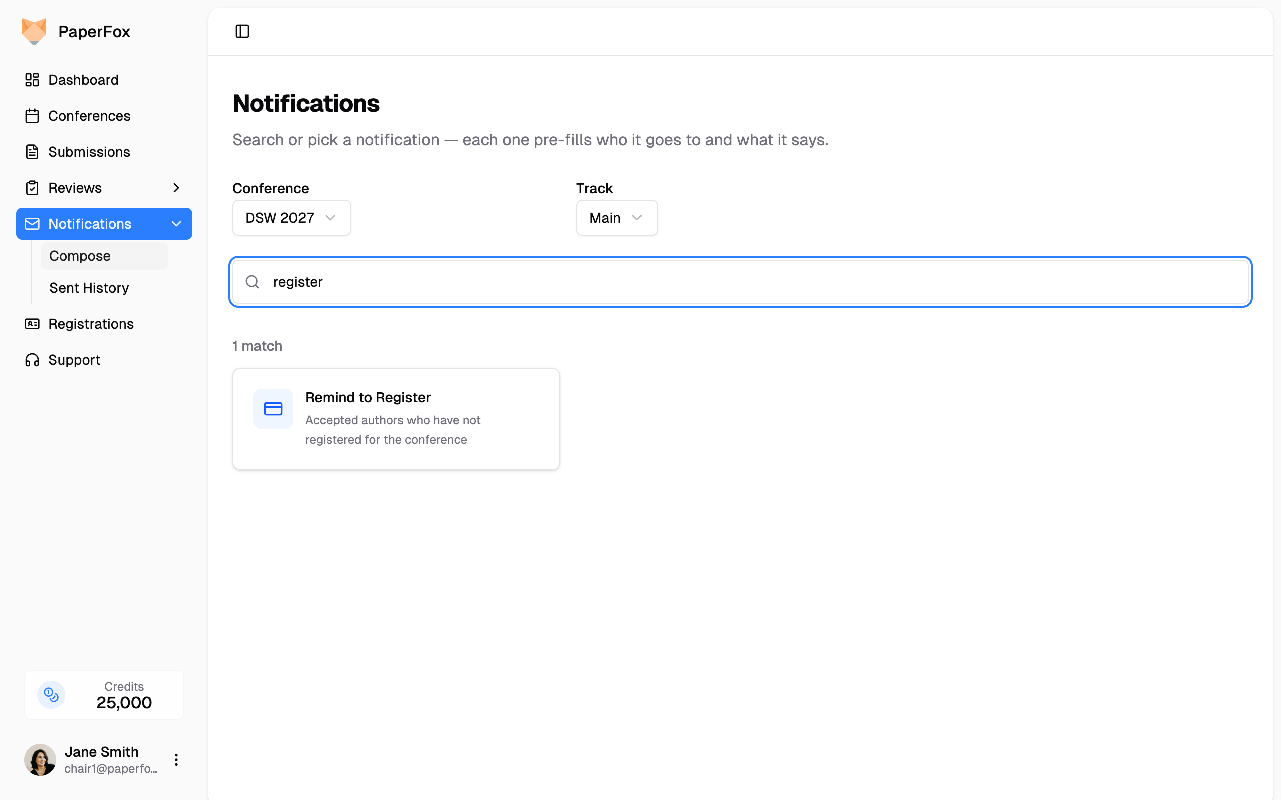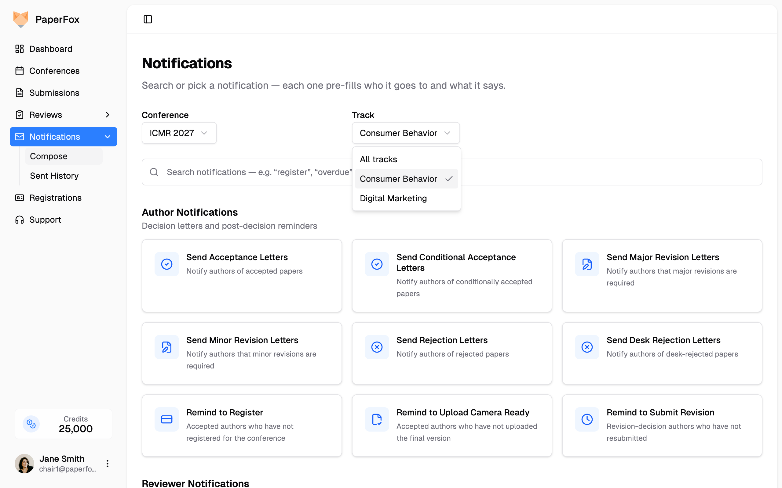 PaperFox sends every chair-facing email through one place — the Notifications hub at /notifications. The hub lists pre-built notifications (called presets) for the things chairs do over and over: send decision letters, remind authors to register, ping reviewers about overdue reviews, broadcast announcements. Click a preset card and the composer opens with the right audience and template already filled in.