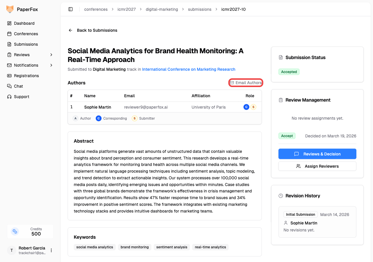 Guide for track chairs to send email notifications to authors, reviewers, and track chairs
