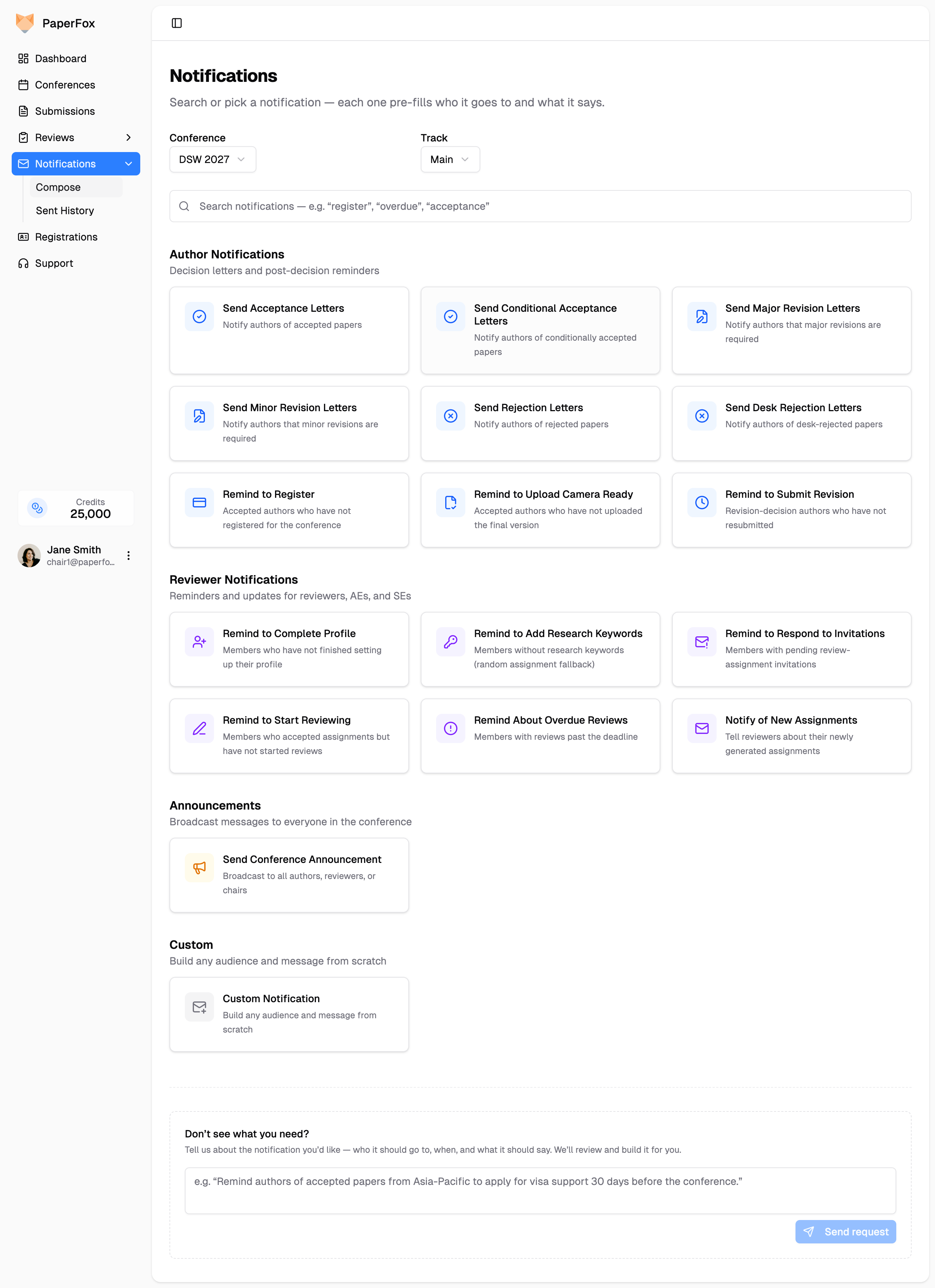 Below the preset cards on the hub there's a request form. If your conference needs a notification that doesn't exist yet — for example, a visa-support reminder for accepted authors from a specific region — describe what you'd like in the form and click Send request. PaperFox support reviews each request and adds new presets as patterns emerge.