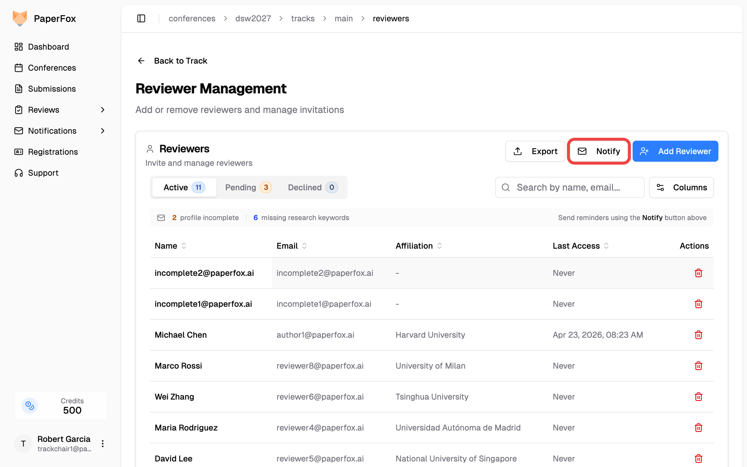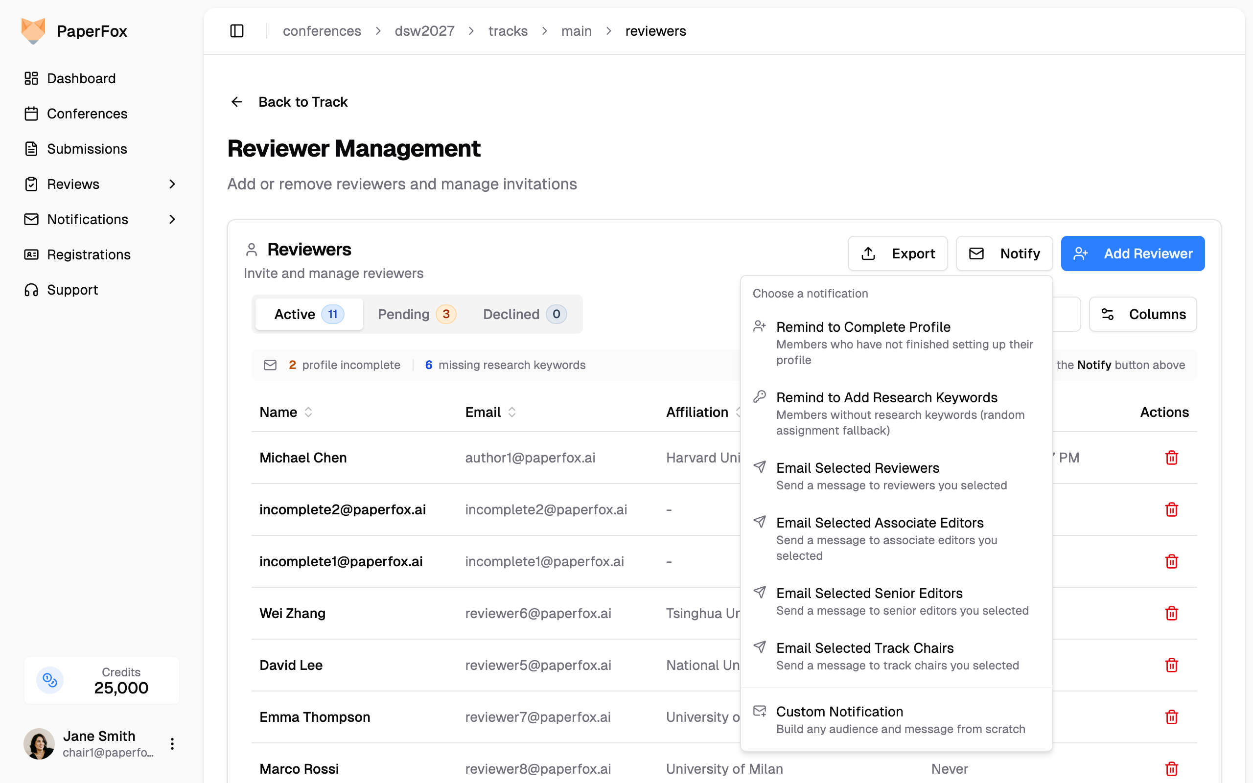 | Remind to Complete Profile | Reviewers who accepted their invitation but haven't completed their PaperFox profile (name, affiliation, etc.) |