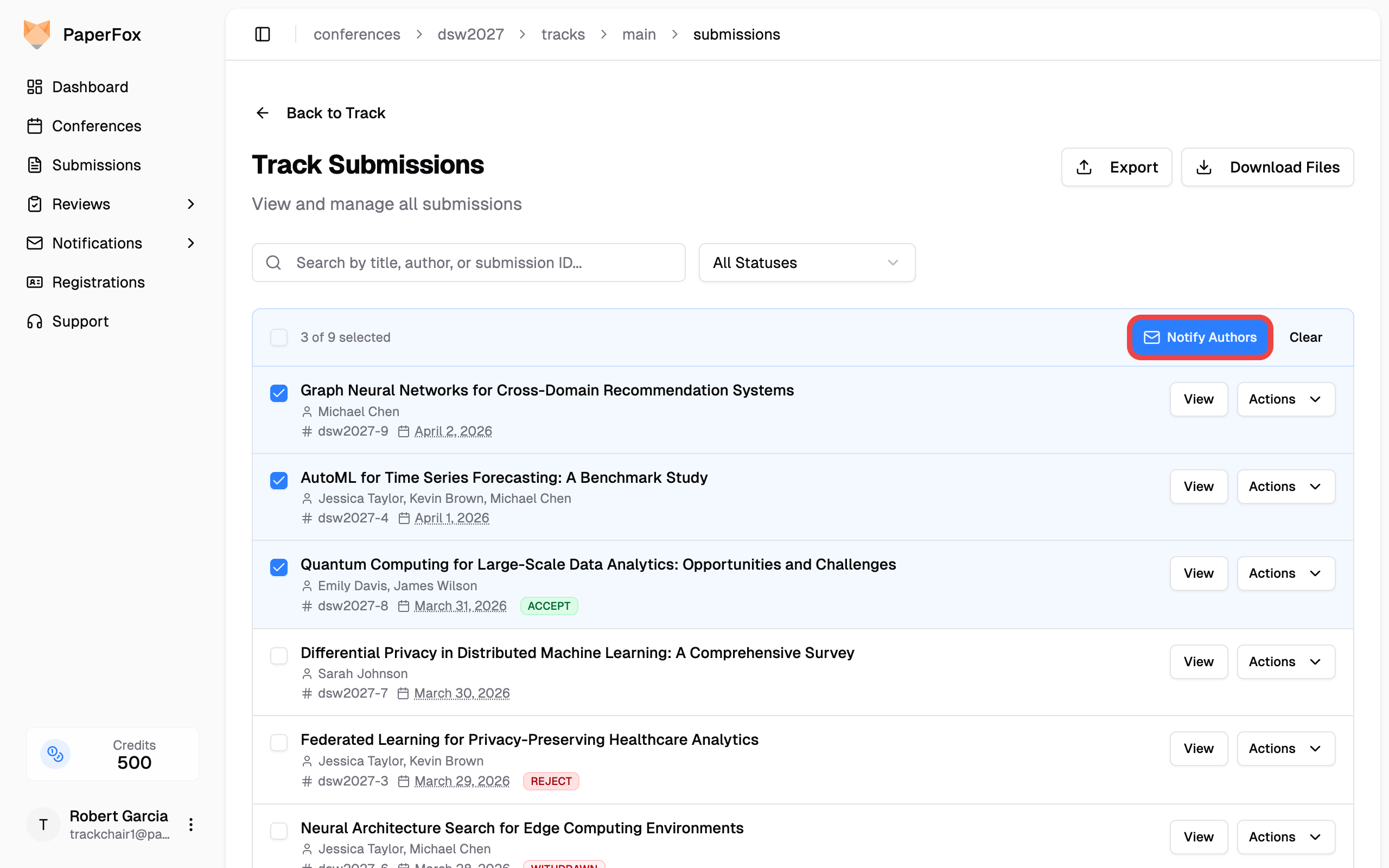 When you want to email the authors of several specific papers — for example, all accepted papers in a track, or a hand-picked shortlist — use the bulk-select tool on the Track Submissions page.