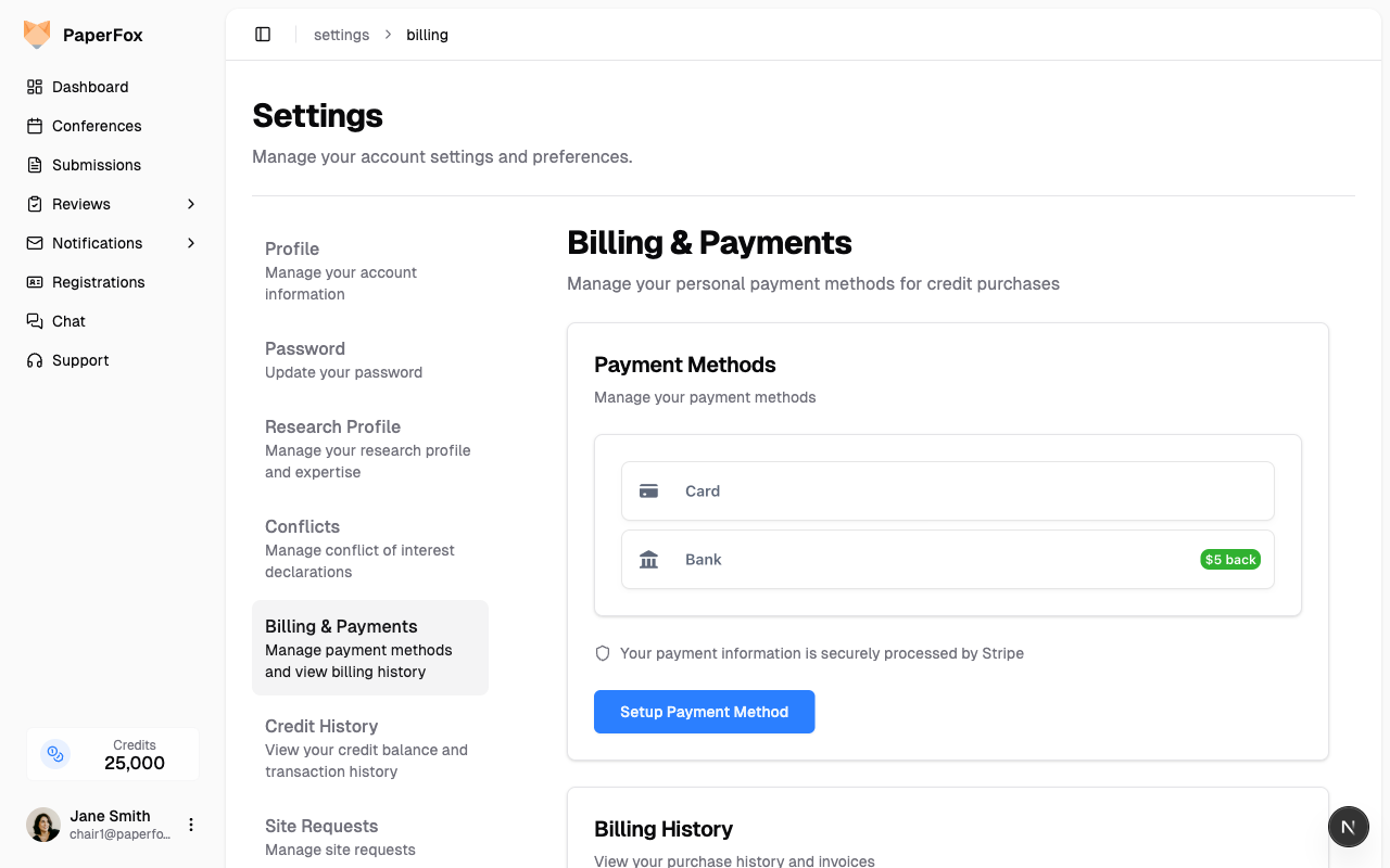 Important: Any conference chair can add a payment method. The payment method is tied to the specific conference, not to your personal account.