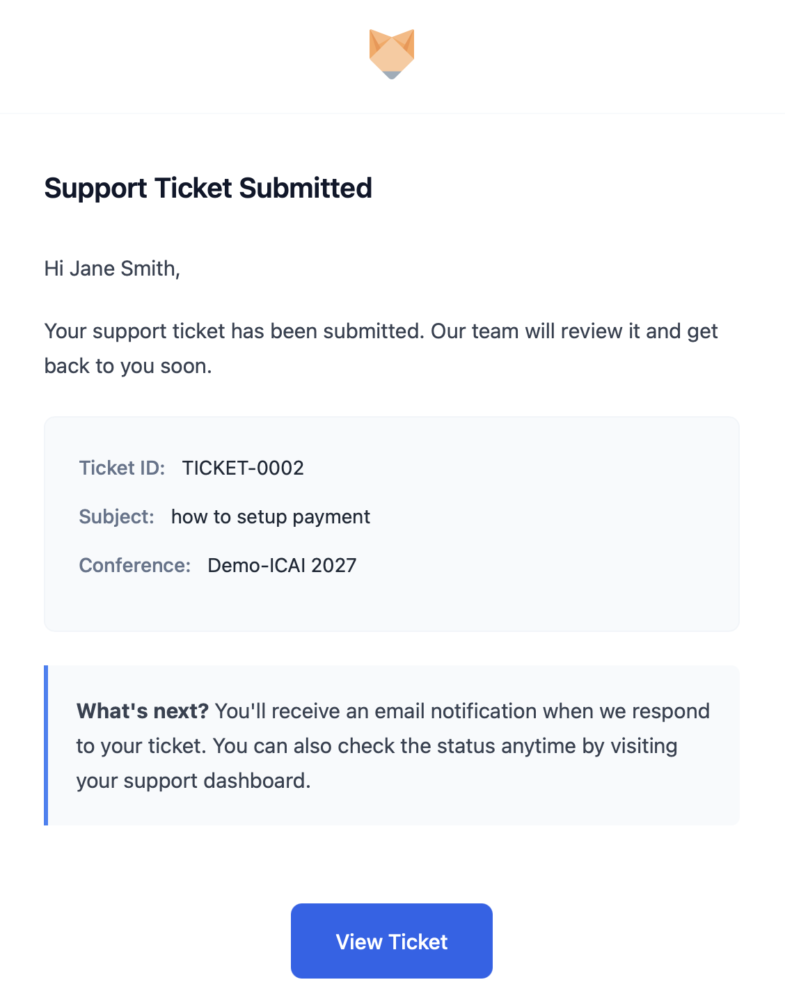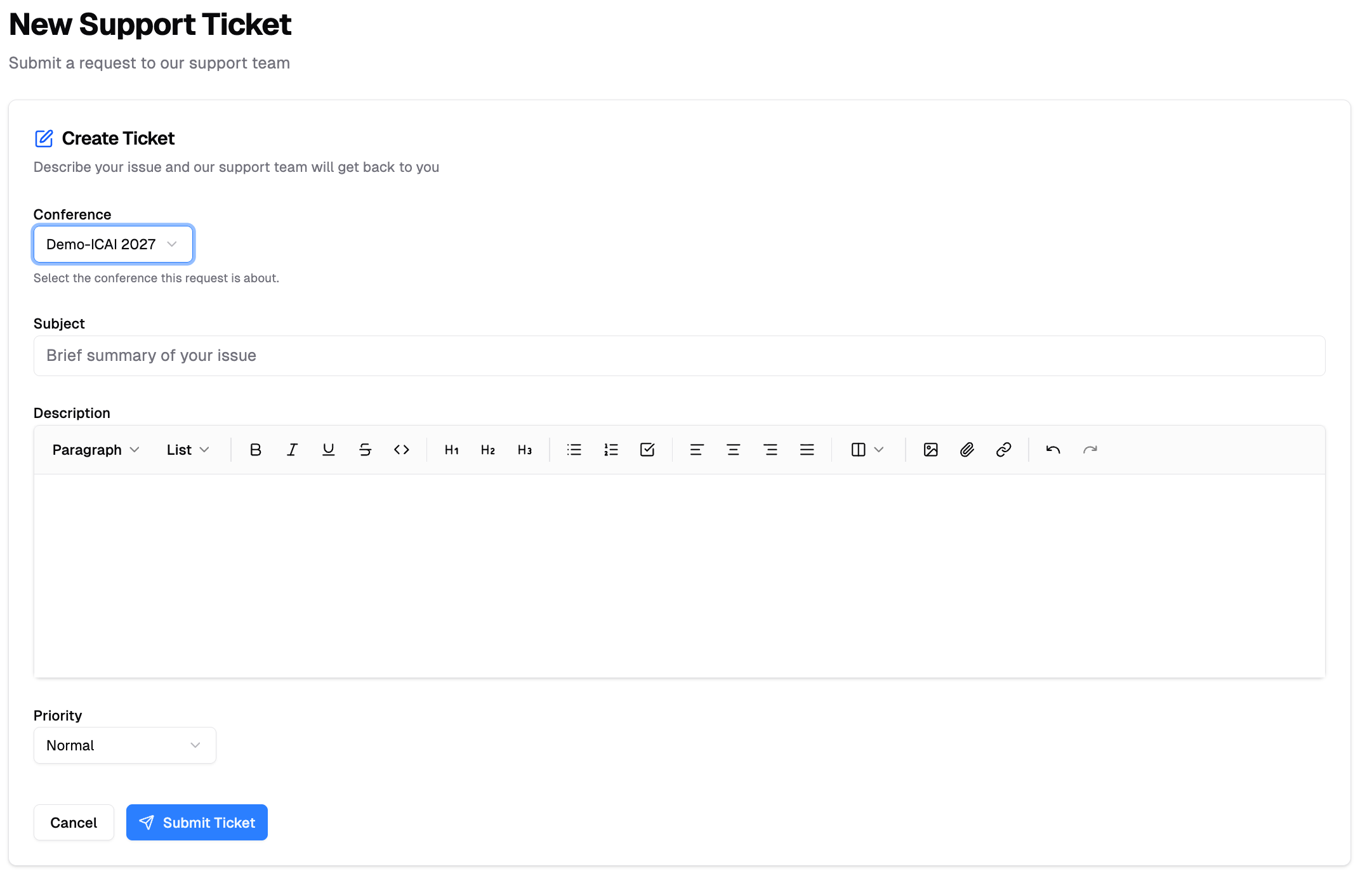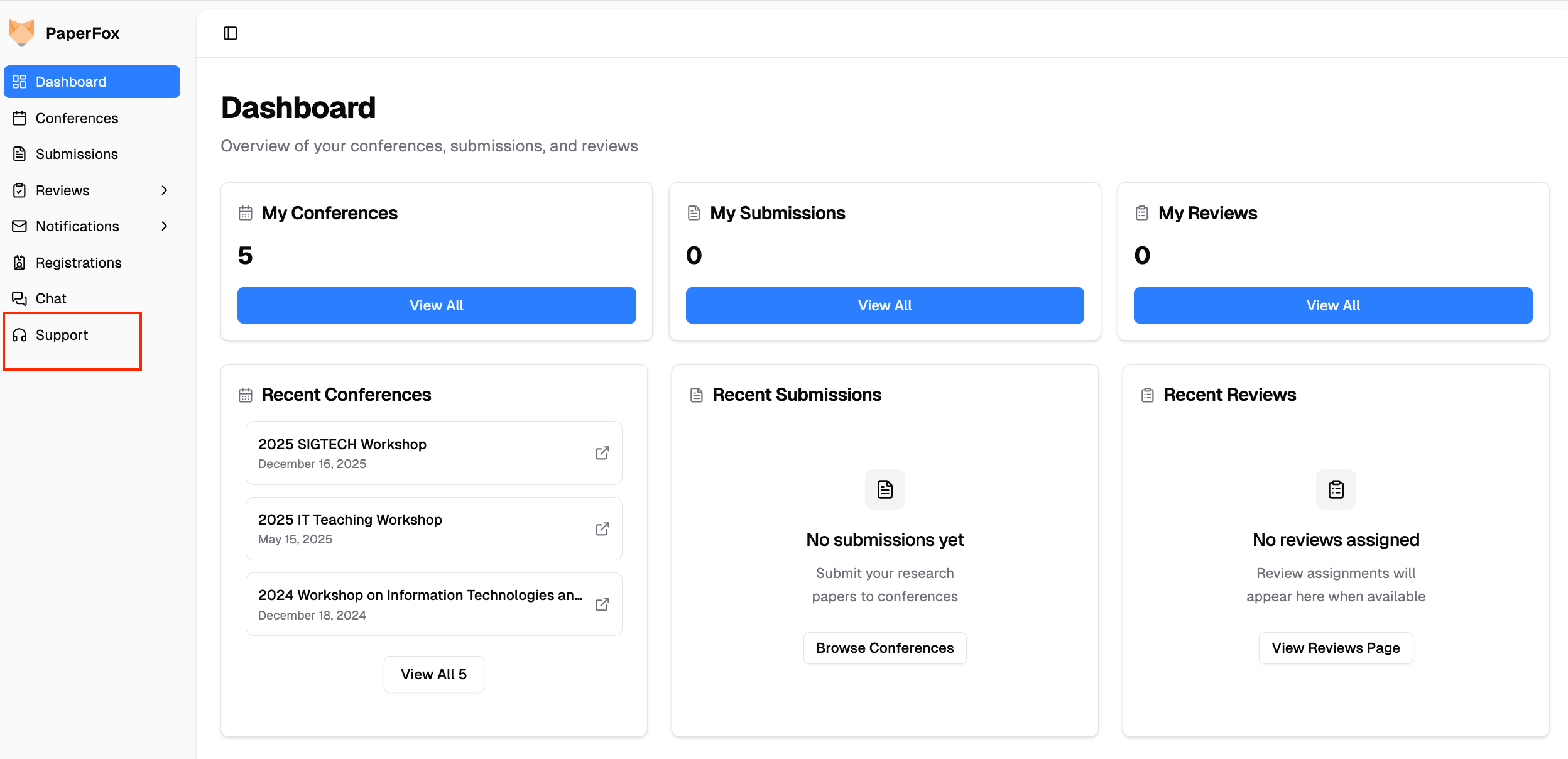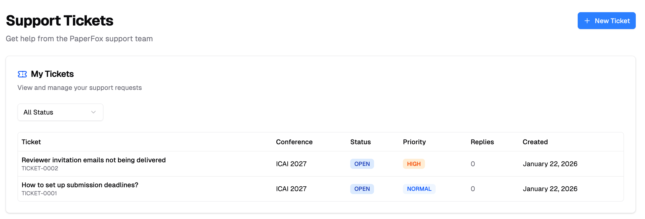 Support tickets provide dedicated assistance from the PaperFox support team for conferences with an active support package.