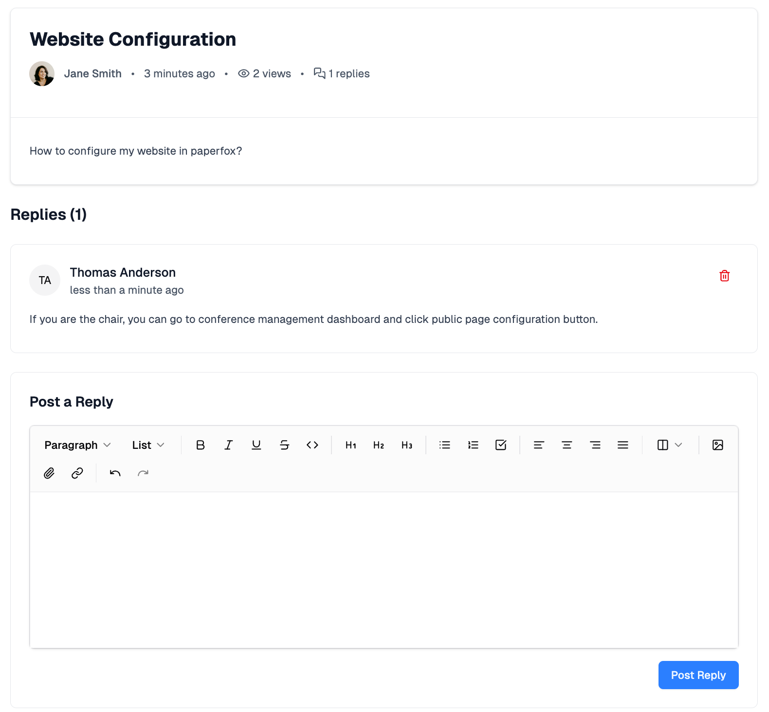 Conference chairs can get help through two channels: dedicated support tickets (for conferences with support packages) or the free community forum.