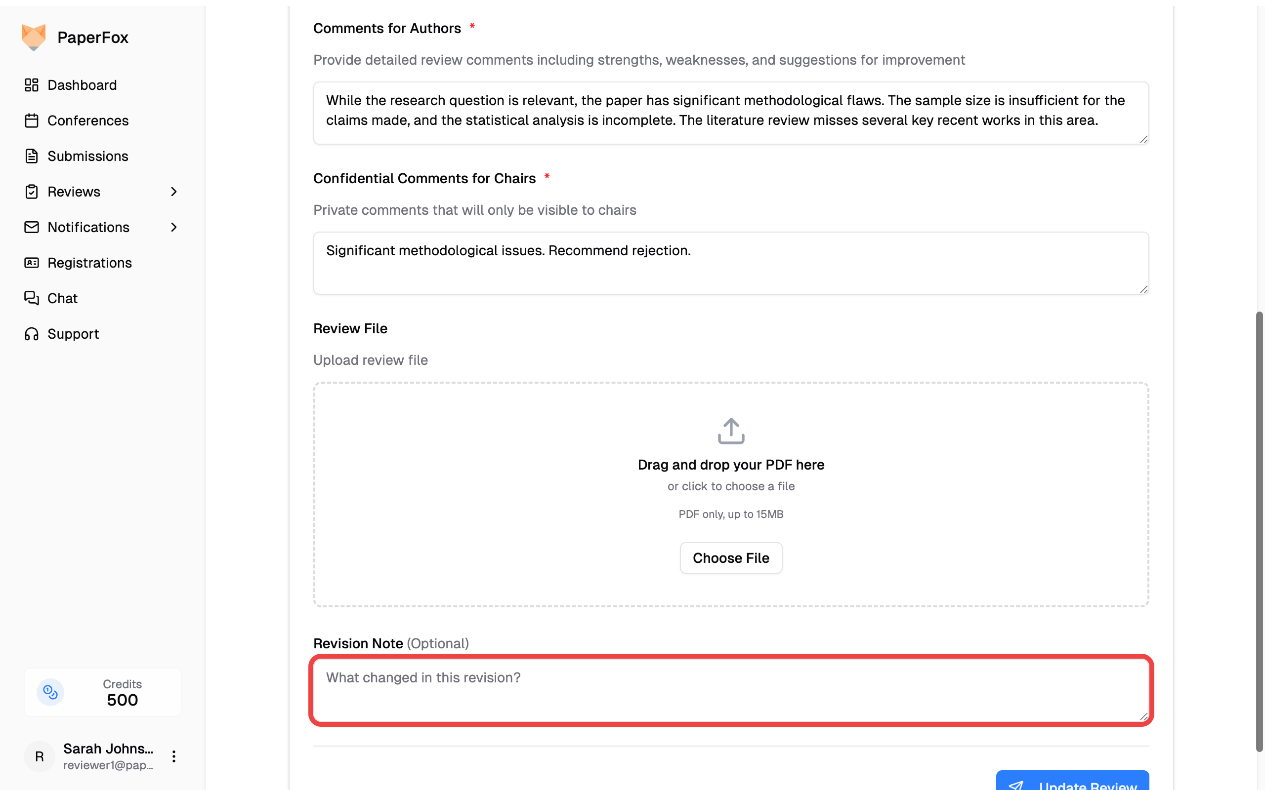 - Optionally, add a Revision Note describing what changed — this helps track chairs understand the update