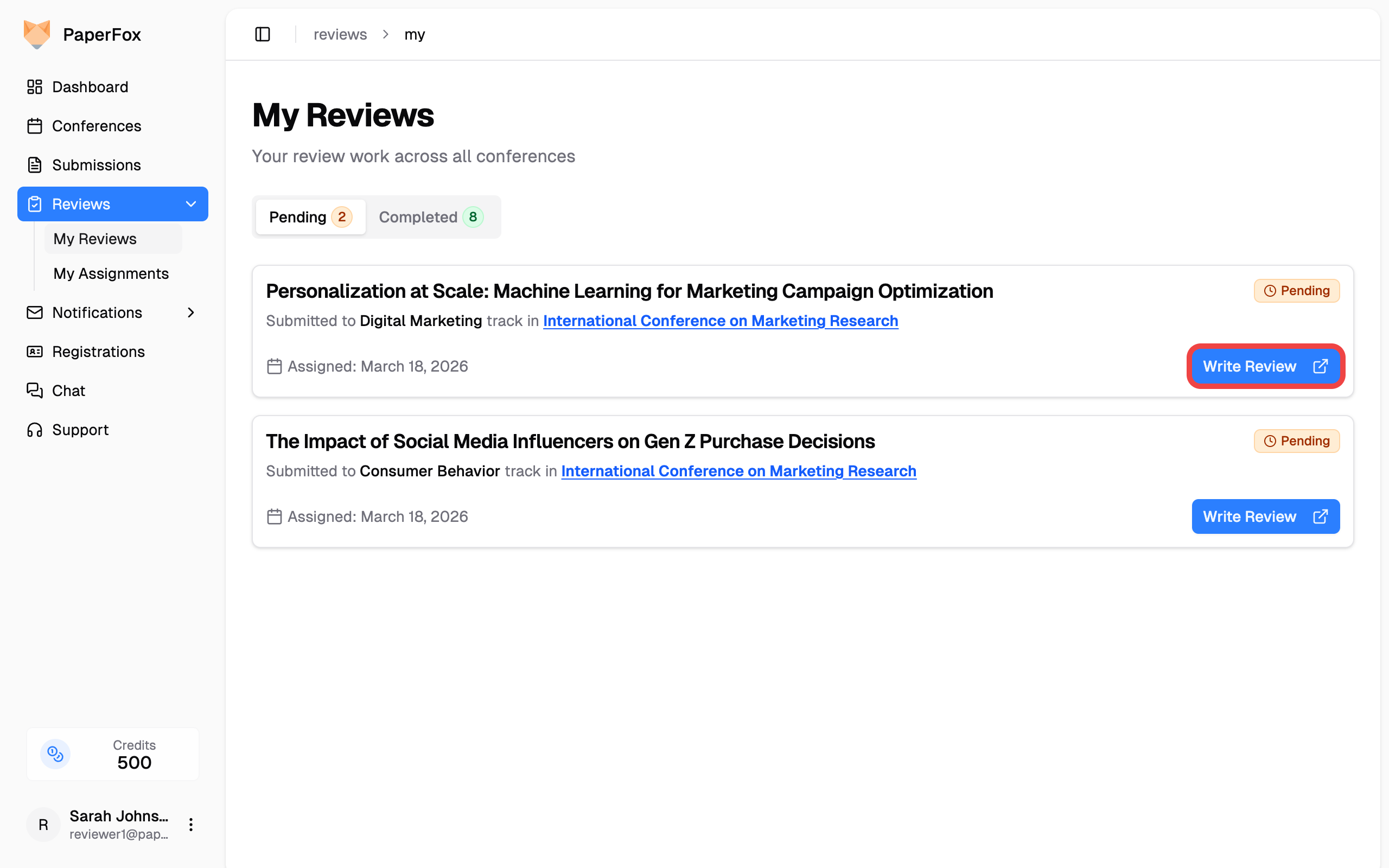 - The Pending tab shows assignments waiting for your review, with paper title, track, conference, and assigned date