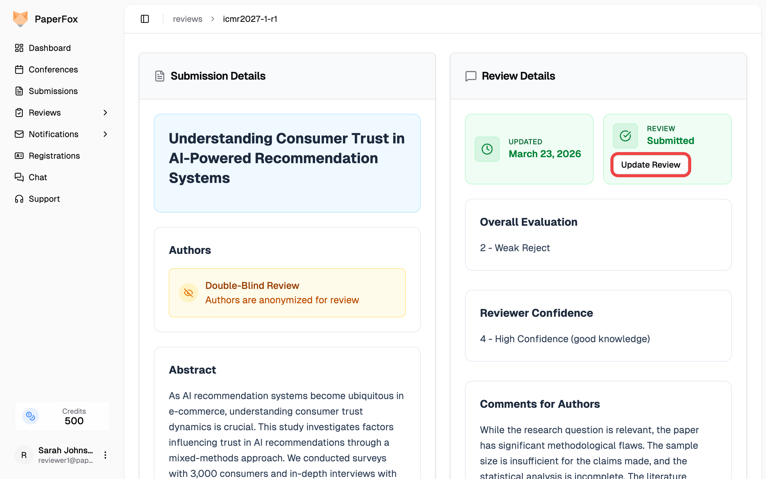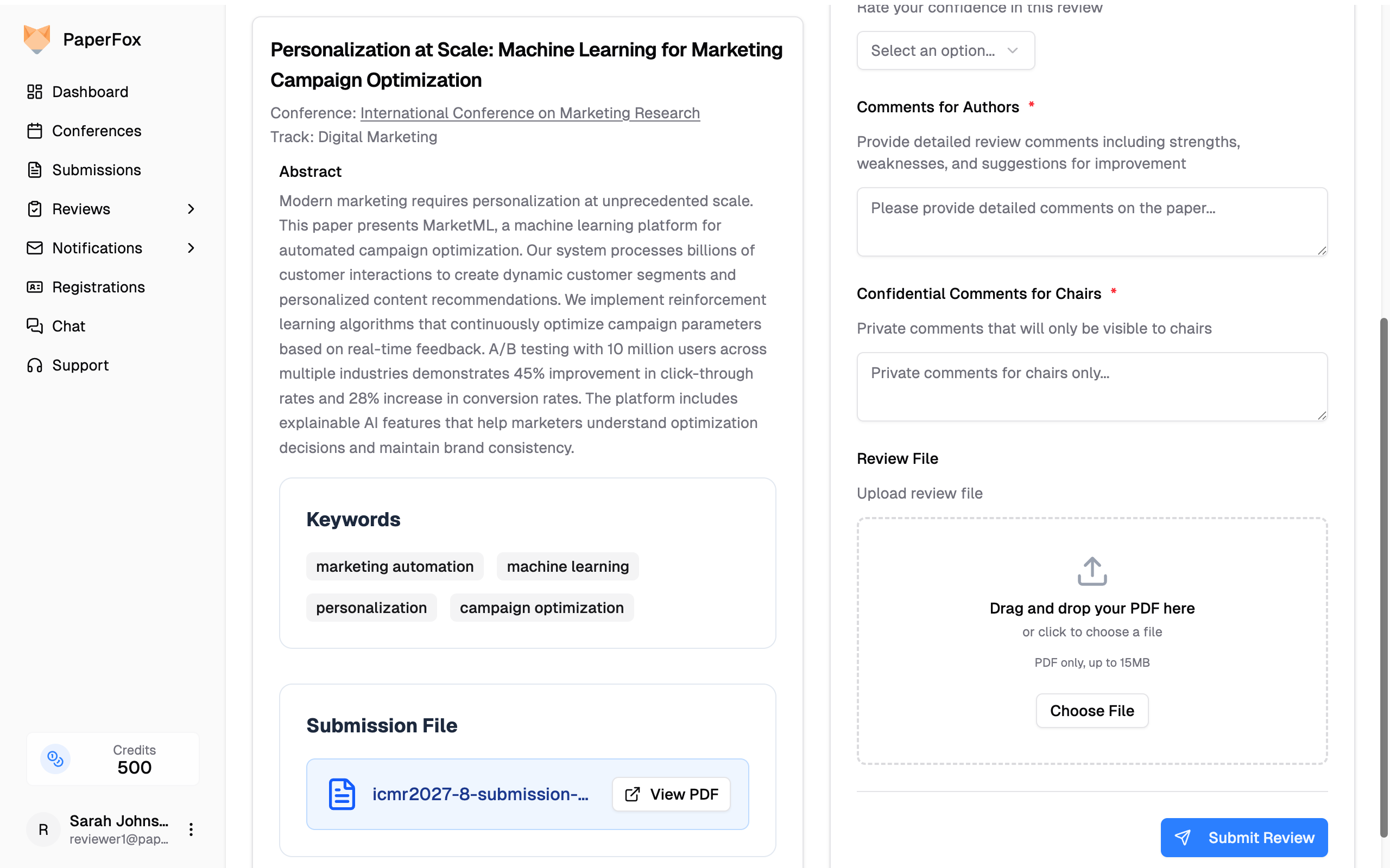 - Left column — Submission details: title, abstract, keywords, and a link to view the submitted PDF