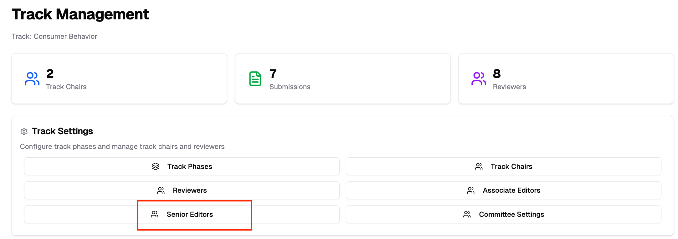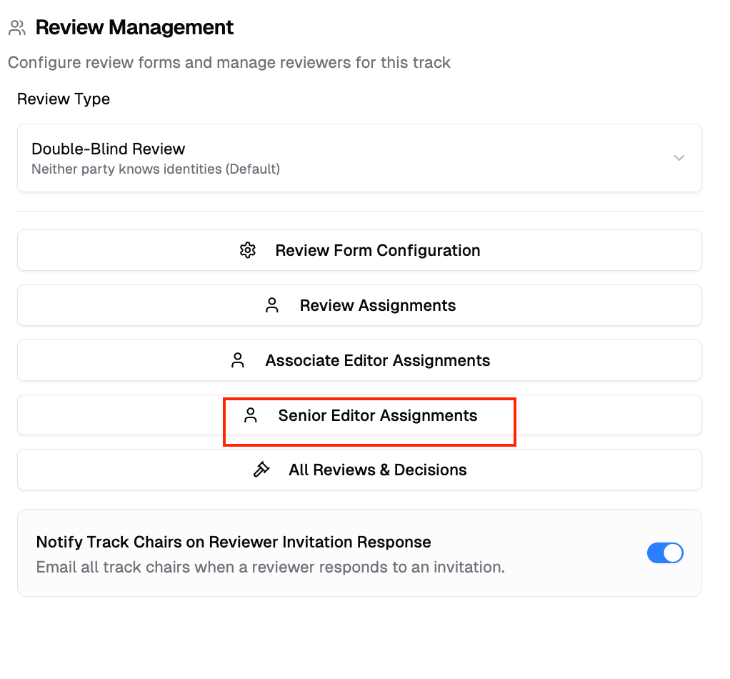 When your track uses a hierarchical committee structure, you assign papers to Senior Editors who then distribute them to Associate Editors.