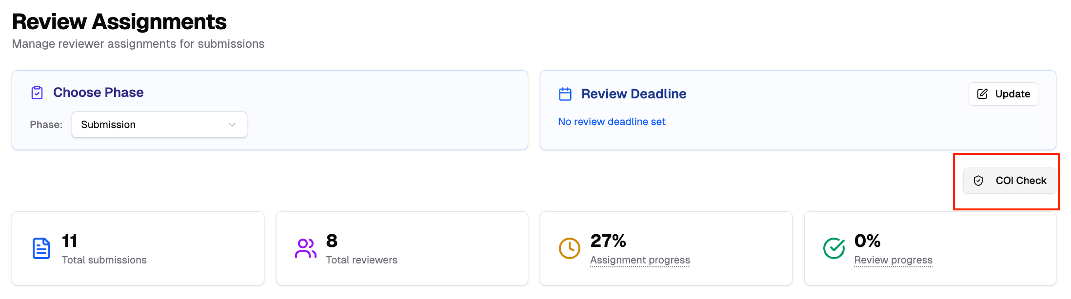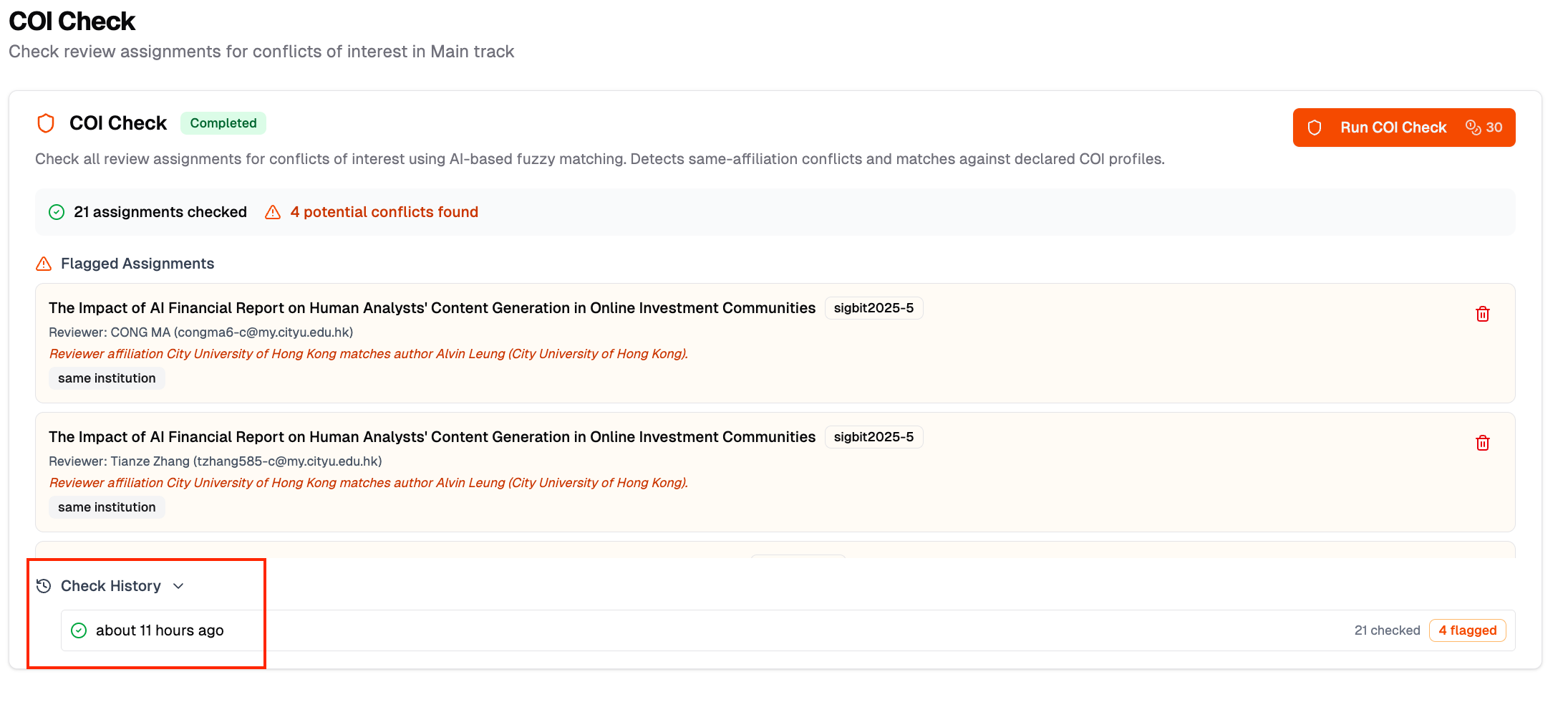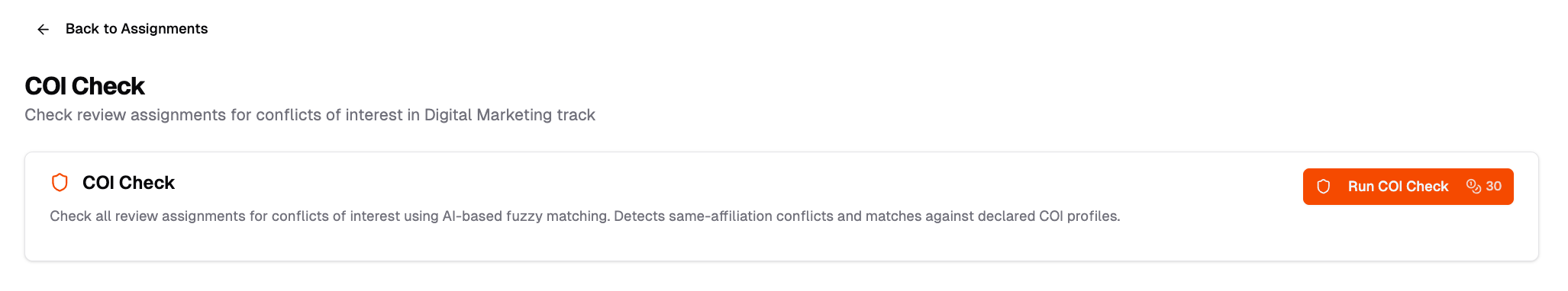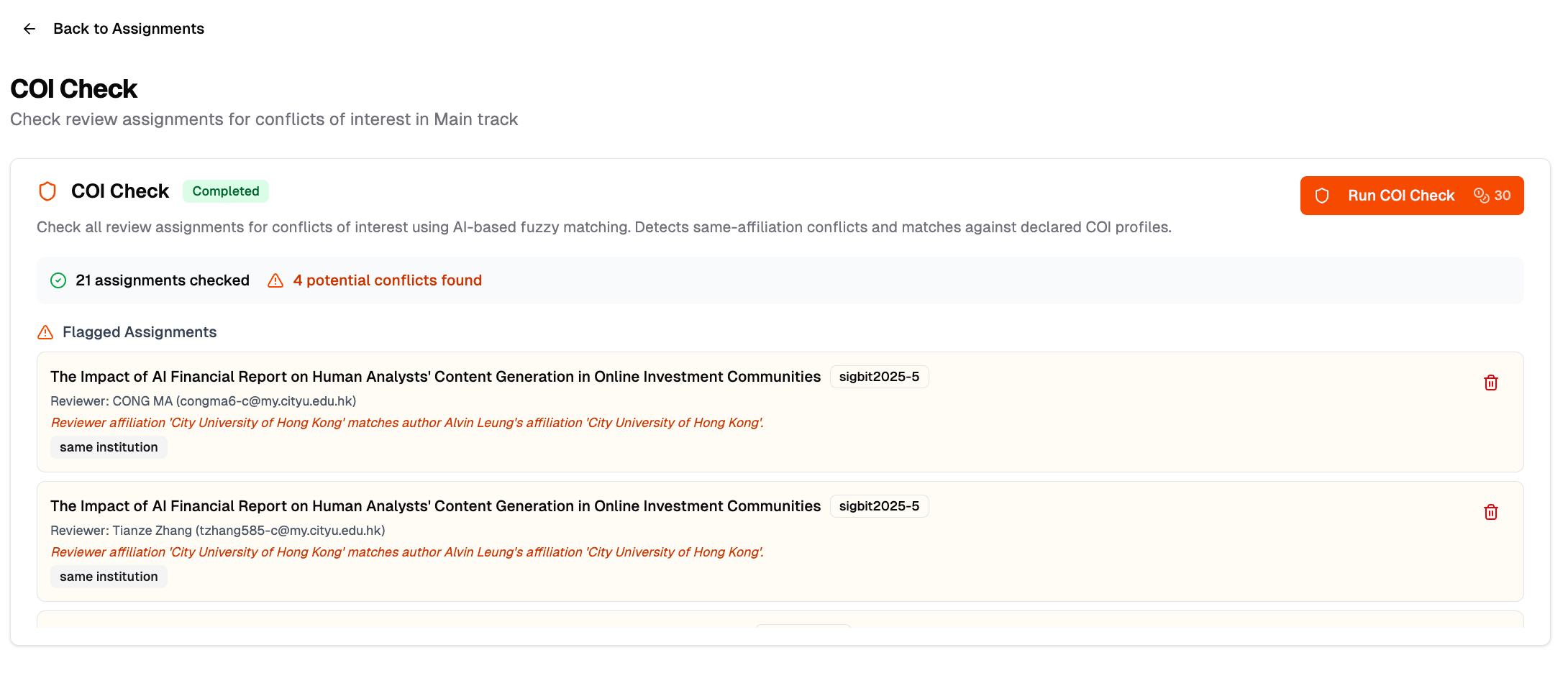 AI Conflict of Interest (COI) Check validates all review assignments in your track to detect potential conflicts of interest between reviewers and paper authors.