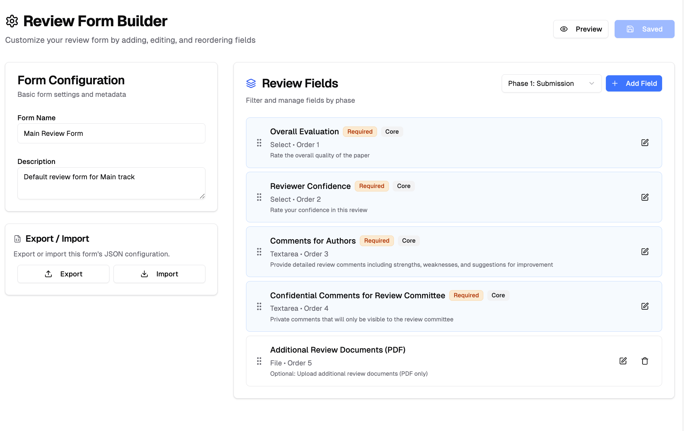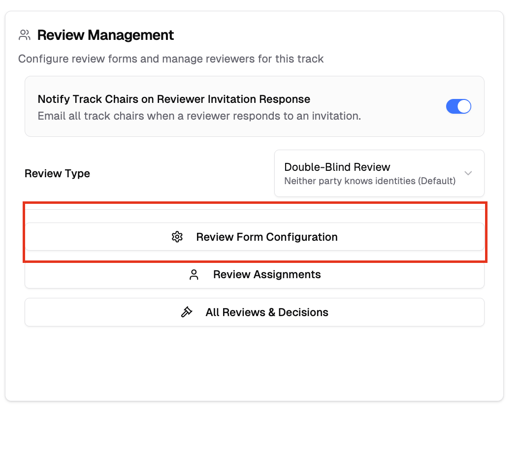 Track chairs can customize review forms to match their evaluation criteria and review process. The review form builder provides the same interface as submission forms but focuses on reviewer evaluation fields.