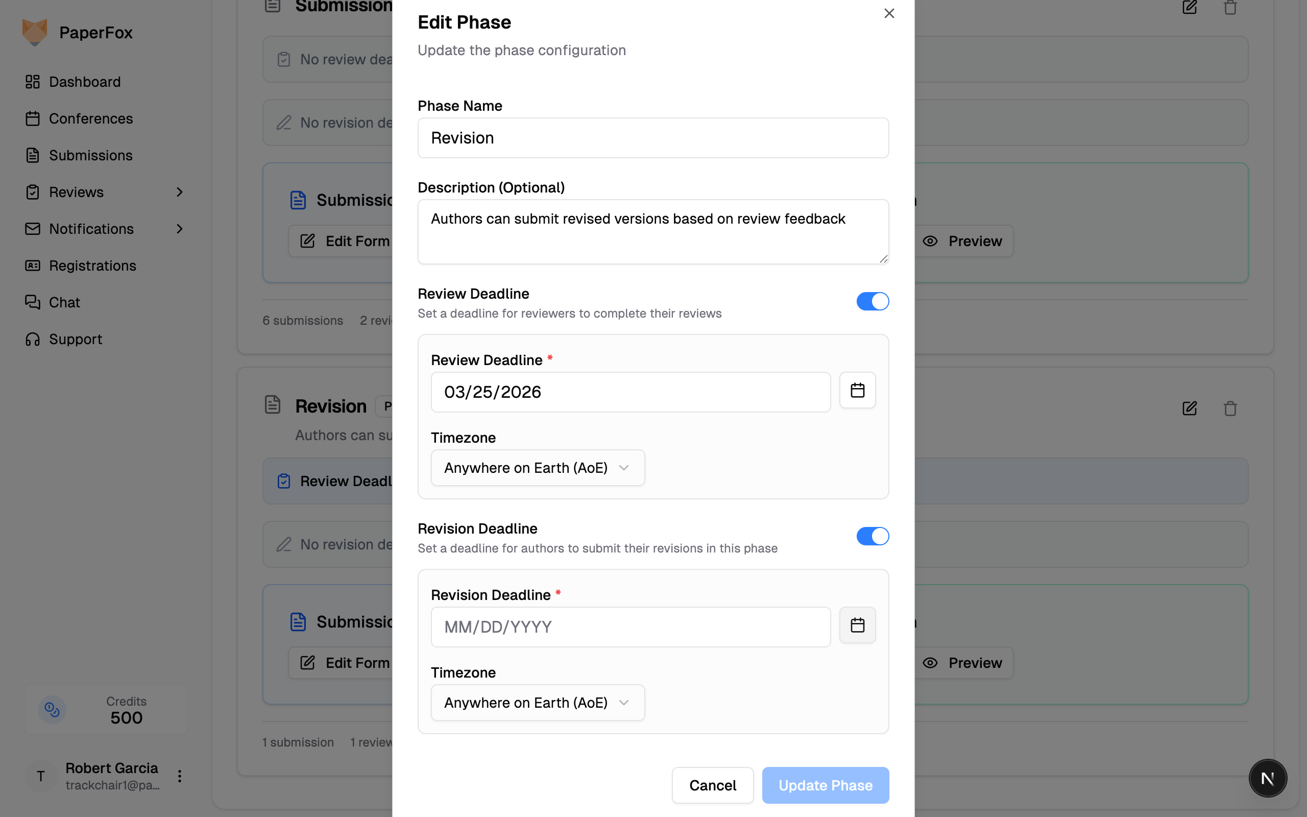 - Toggle on Review Deadline or Revision Deadline