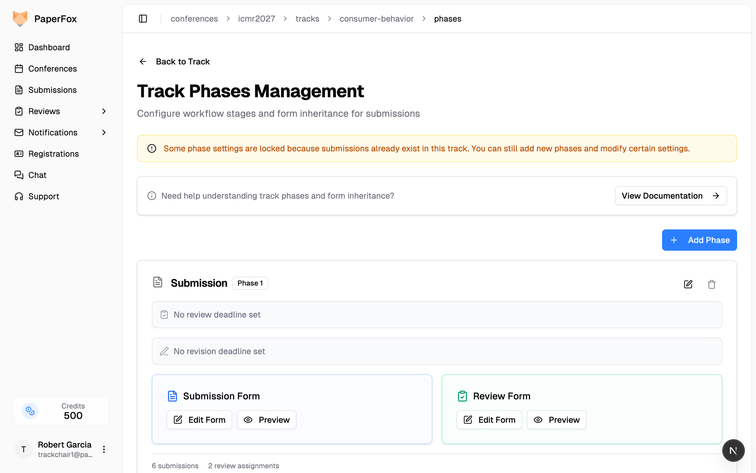 A phase represents a distinct stage in your track's submission workflow. Each phase can have its own forms, review process, and deadlines. Each paper tracks its current phase independently.