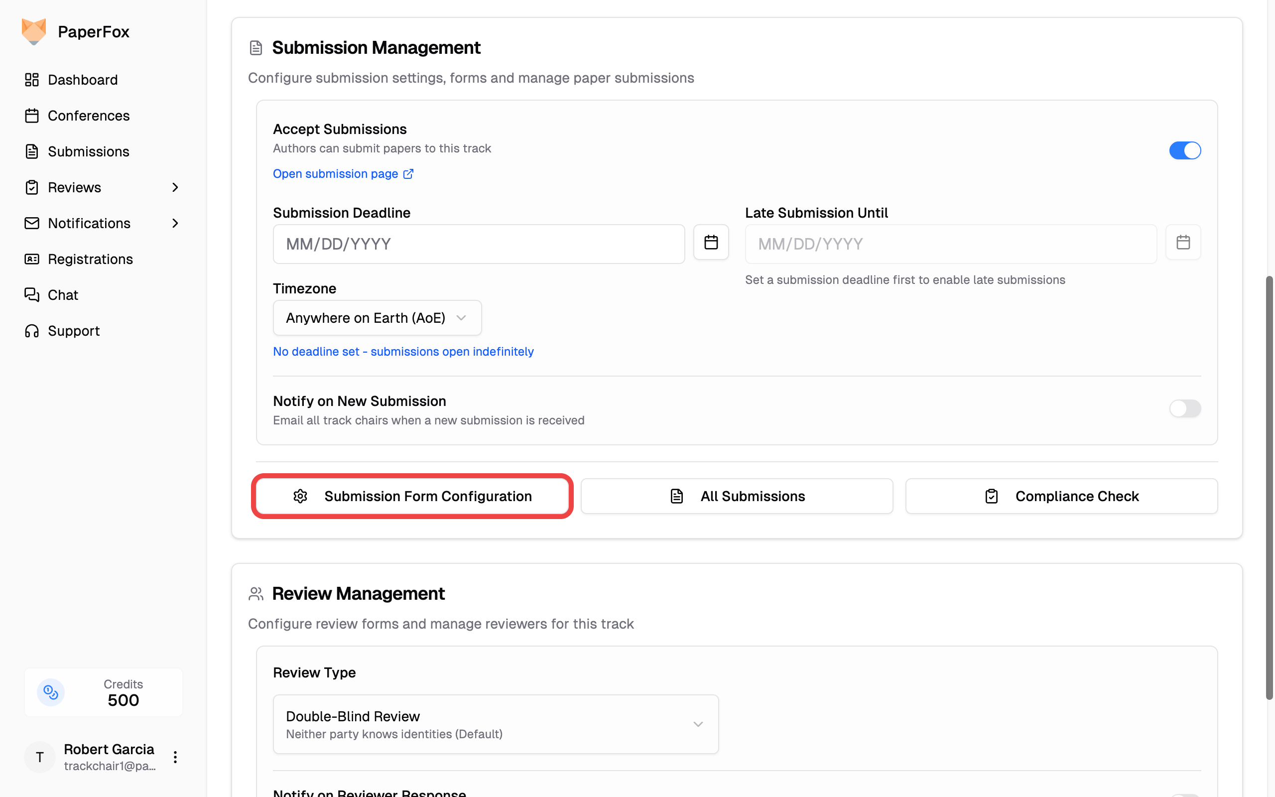 As a track chair, you can customize your track's submission form to collect the specific information needed for your review process. The form builder allows you to add, edit, and organize fields across different submission phases.