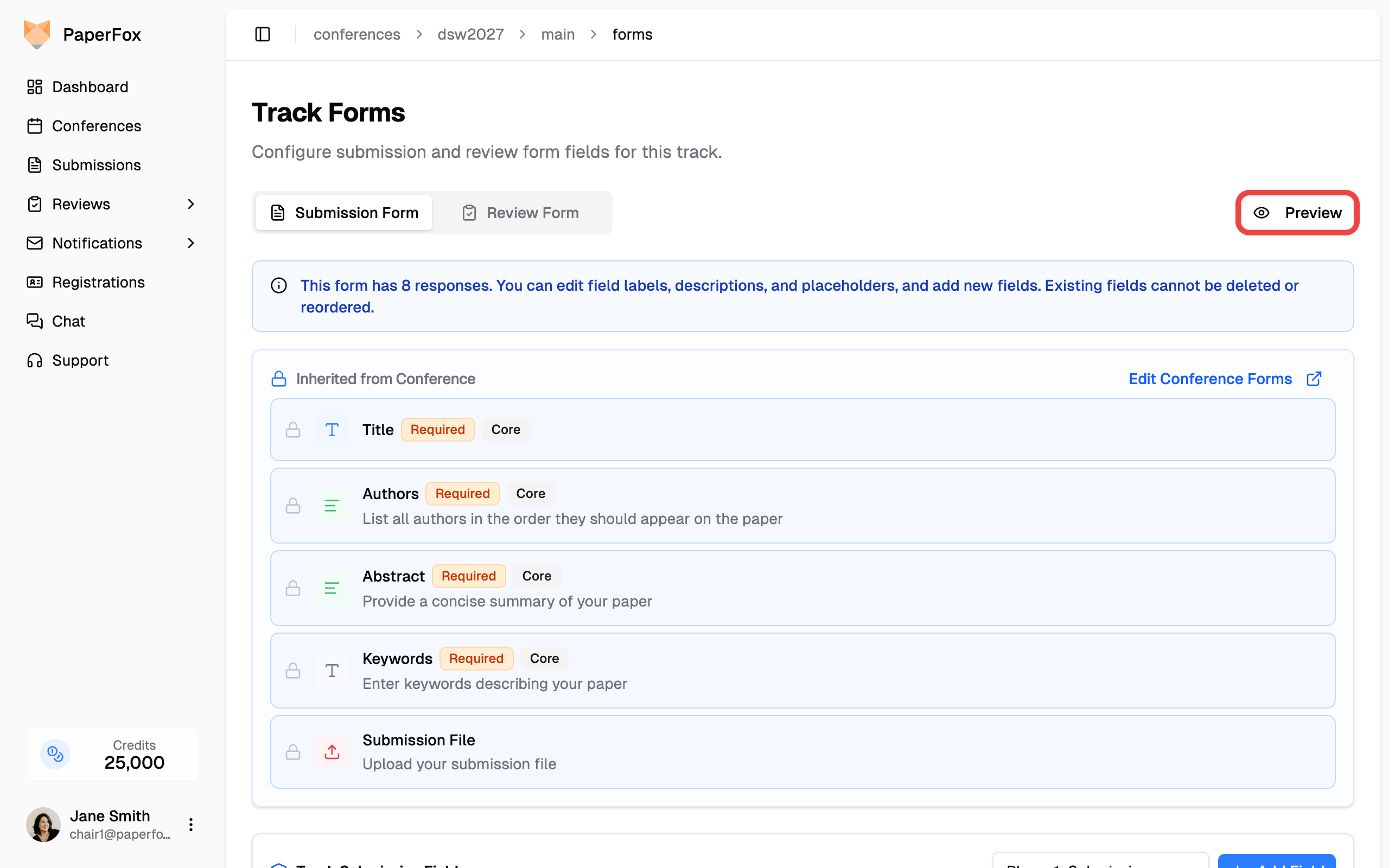 The preview includes both conference-level inherited fields and your track-specific fields, showing the complete form authors will see.