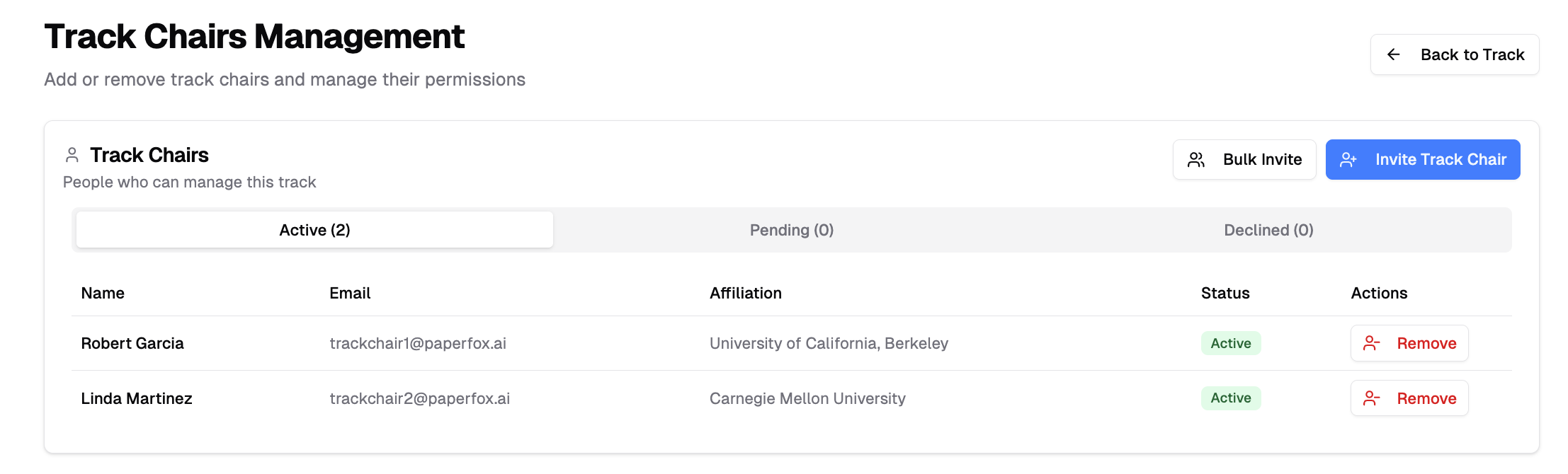As a track chair, you can invite other colleagues to help manage your track. Co-track chairs have equal access to track management functions.