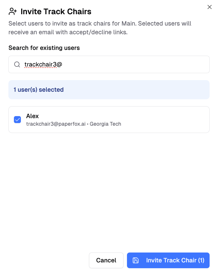 - If the person is not an existing PaperFox user, they will receive an invitation email. Upon accepting, they will be automatically registered and added as a Track Chair.