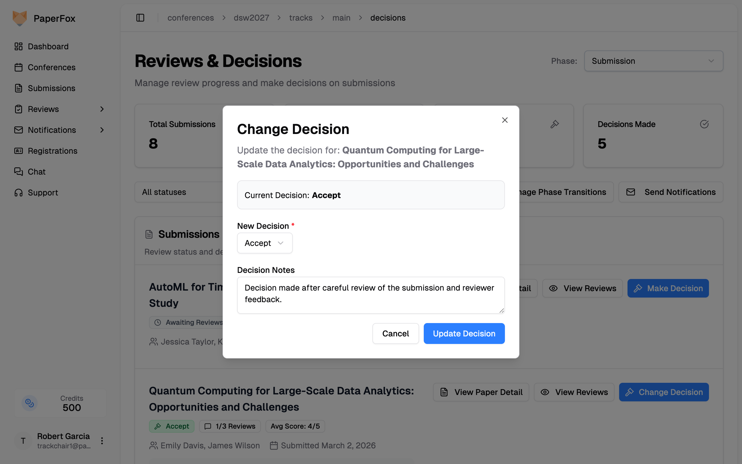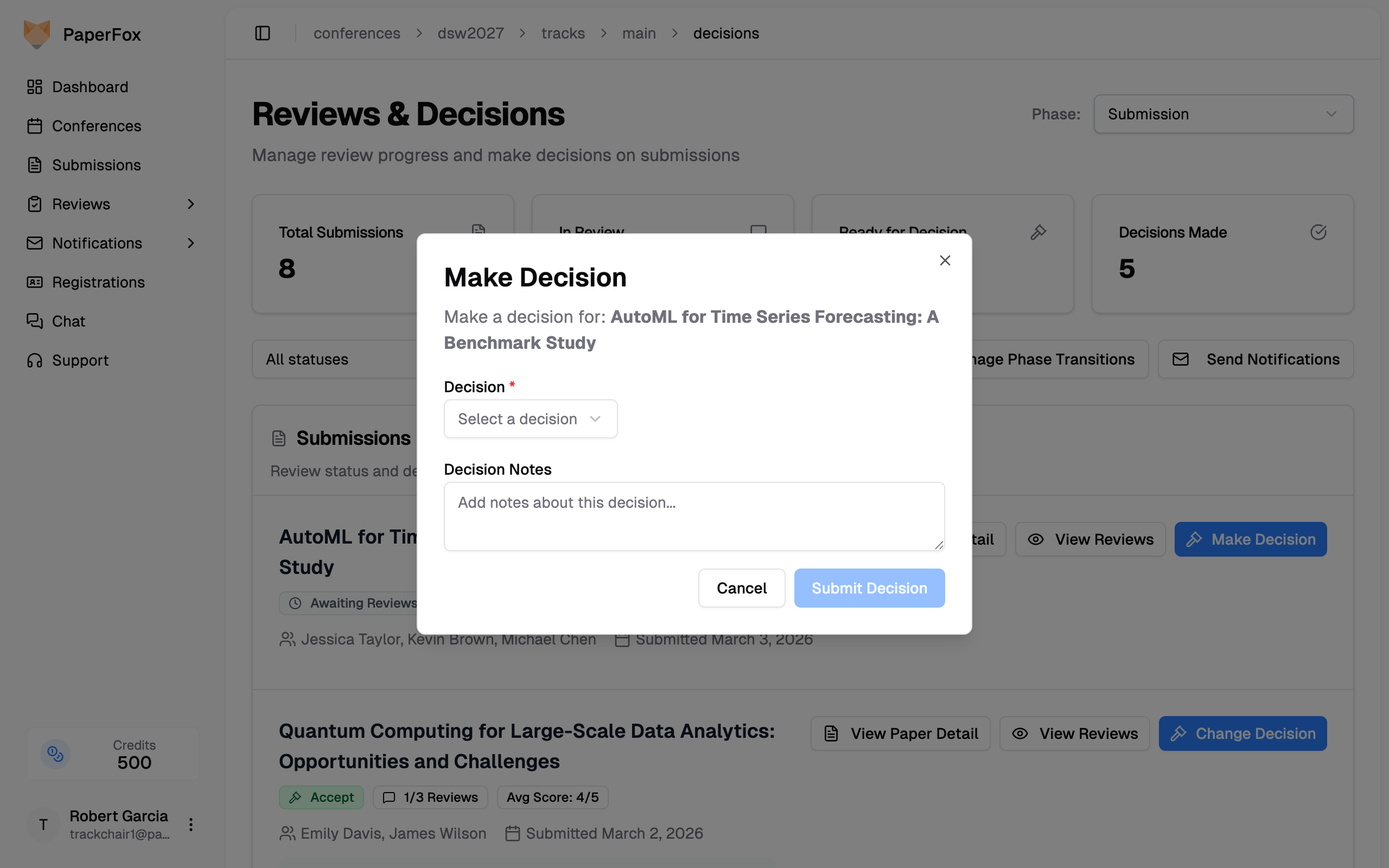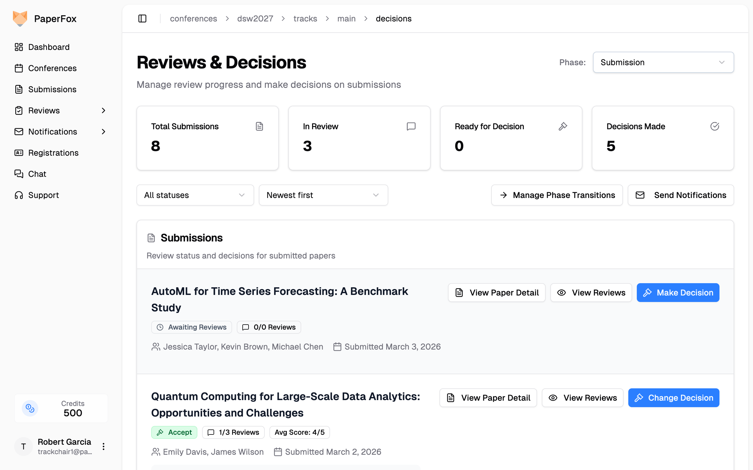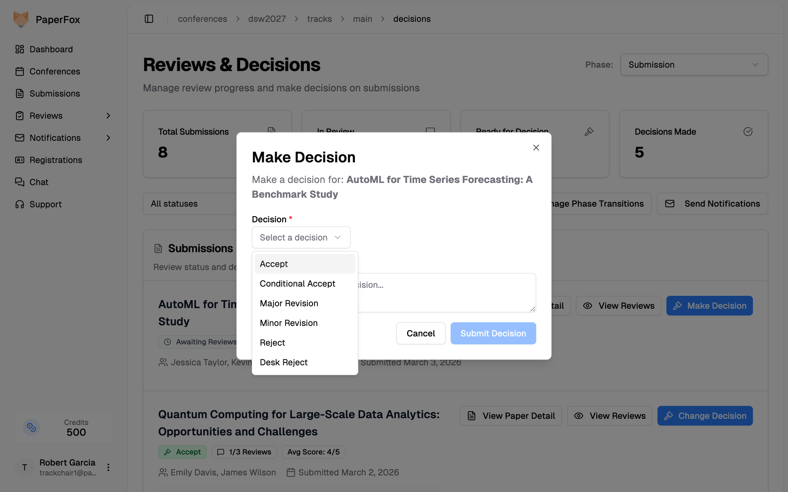 The Reviews & Decisions page is where track chairs review submission progress and make acceptance decisions. You can access it from your track management page under Review Management → Reviews & Decisions.