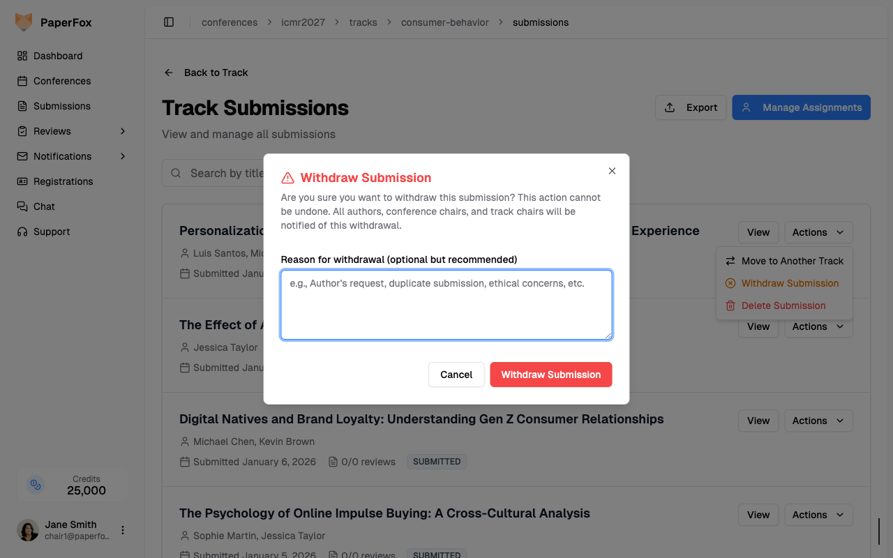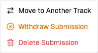 As a track chair or conference chair, you can manage submissions through the Actions dropdown on the Track Submissions page. Two options are available for removing submissions: Withdraw and Delete.