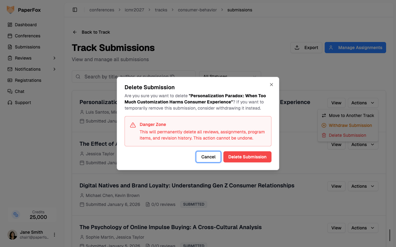 Deleting a submission permanently removes all reviews, review assignments, program items, and revision history. This action cannot be undone.