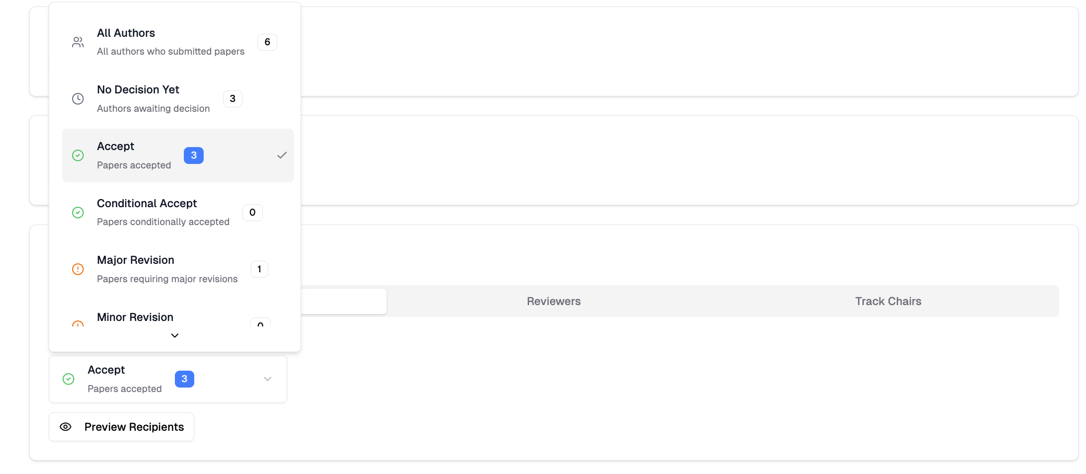 - For authors: filter by decision type (Accept, Reject, etc.)