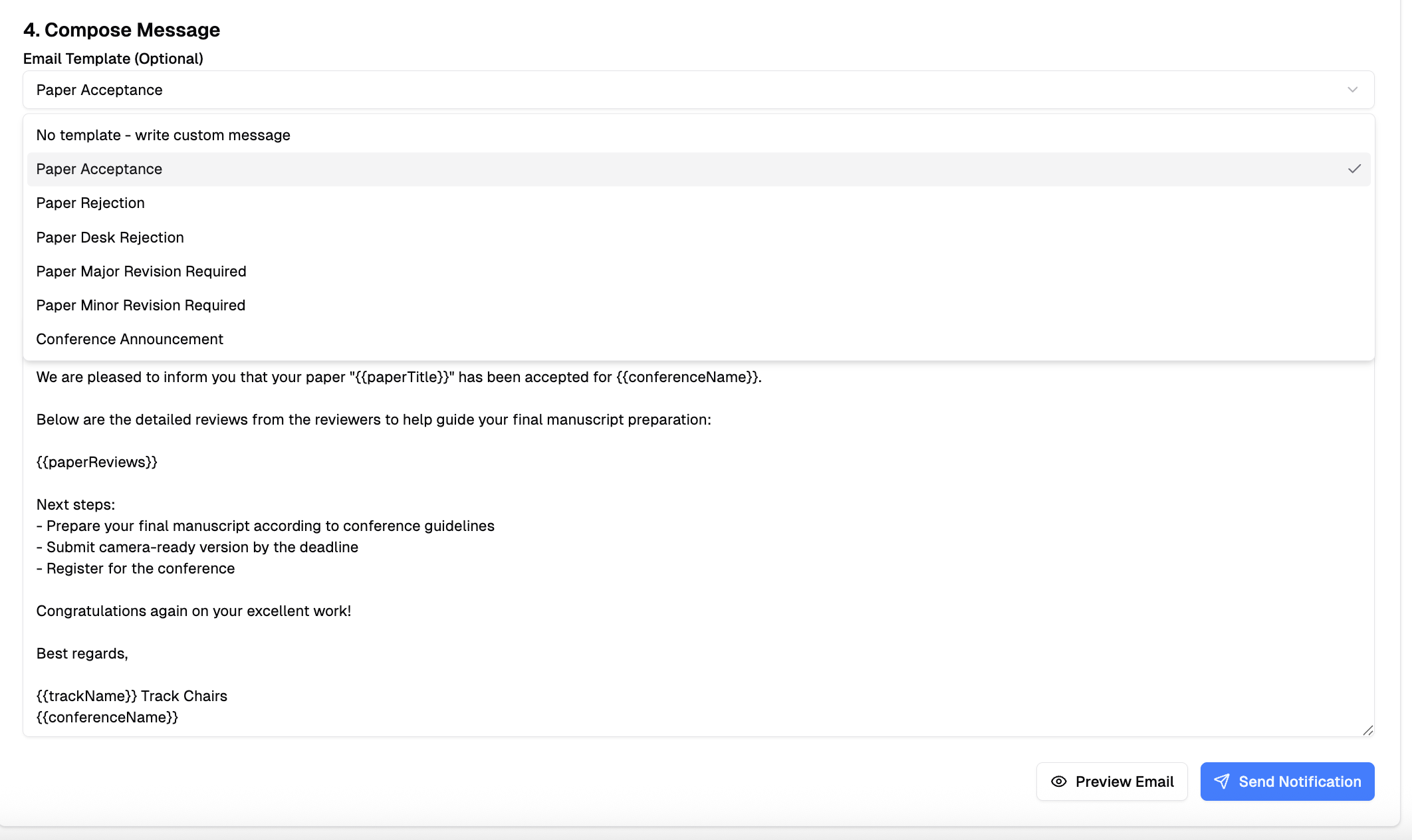 {{recipientName}}— Recipient's name{{conferenceName}}— Conference name{{paperTitle}}— Paper title{{trackName}}— Track name
