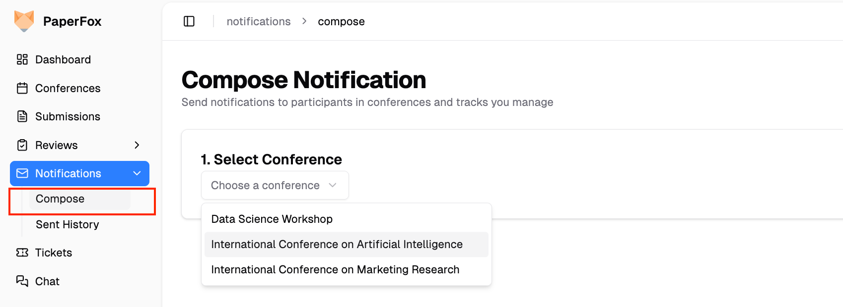 Choose the conference and track you want to send notifications for. You can only send to tracks you manage.
