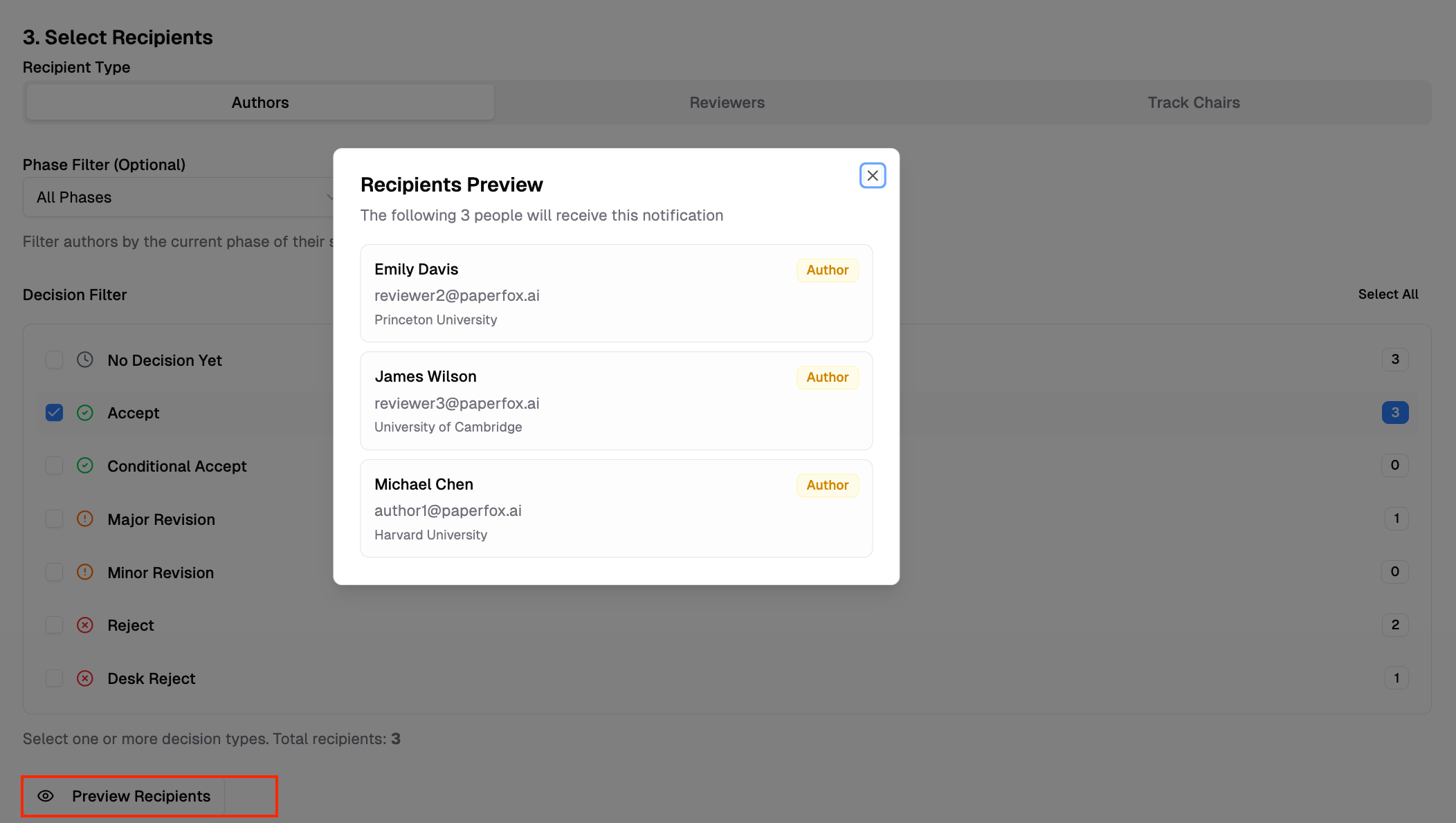 Guide for track chairs to send email notifications to authors, reviewers, and track chairs
