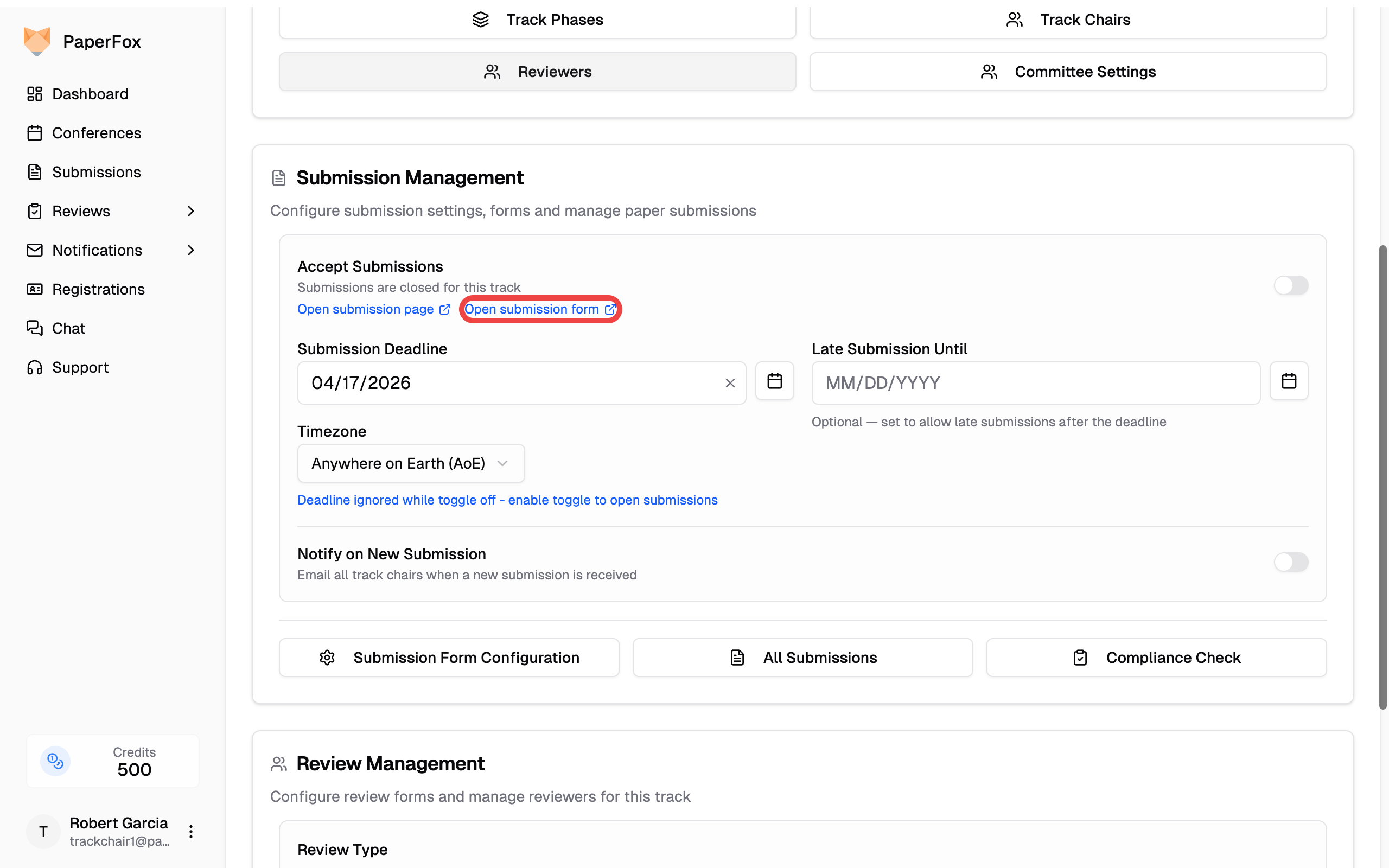 Both conference chairs and track chairs see the submission toggle on tracks they manage. Regular authors do not see it.